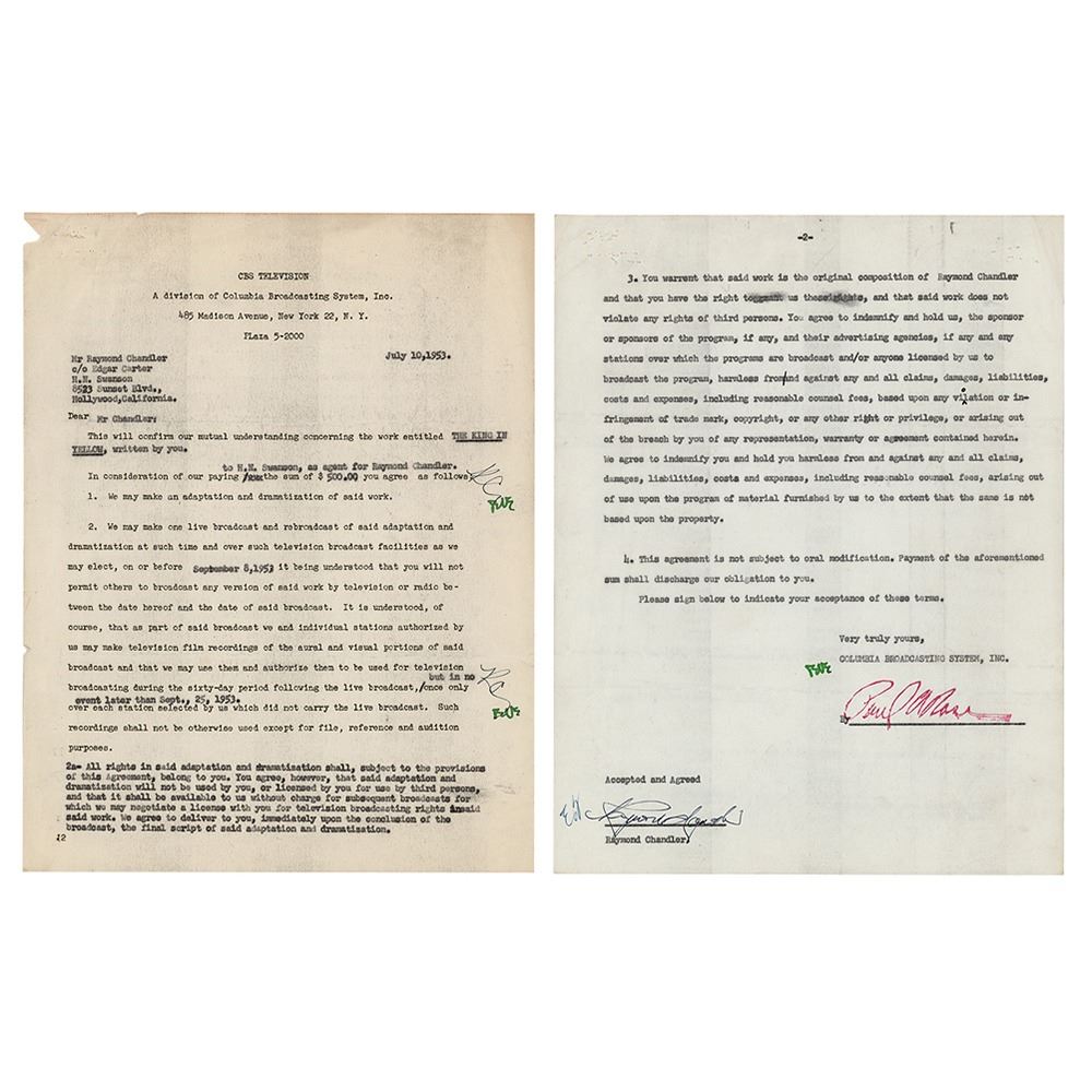 DS, two pages, 8.5 x 11, July 10, 1953. Contract between CBS Television and Raymond Chandler, regarding "an adaptation and dramatization" of the work entitled "THE KING IN YELLOW." Signed at the conclusion in ink by Chandler, who also adds his initials to two corrections on the first page. In fine condition.