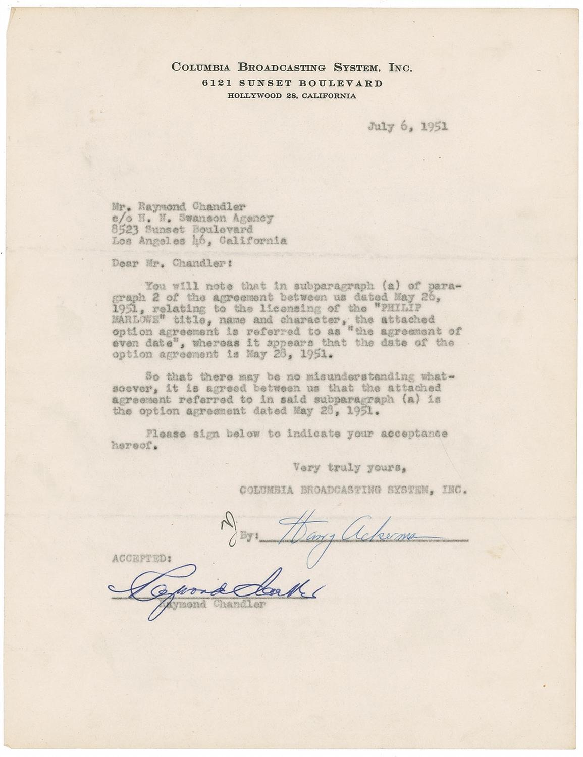 Detective novelist (1888–1959) best known for The Big Sleep and The Long Goodbye. His seven novels center around tough but honest private investigator Philip Marlowe. DS, one page, 8.5 x 11, July 6, 1951. An option agreement between CBS and Chandler clarifying a point “relating to the licensing of the ‘Philip Marlowe’ title, name, and character.” Boldly signed at the conclusion by Chandler. In fine condition, with paperclip impression to top edge, and a few minor creases. Chandler was notoriously unhappy with CBS’s efforts to create a series around his Marlowe character.