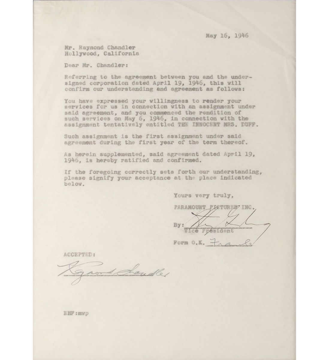 DS, one page, 7.5 x 10.25, May 16, 1946. Agreement between Chandler and Paramount Pictures for him to render services “in connection with an assignment…tentatively entitled The Innocent Mrs. Duff.” Floridly signed at the conclusion by Chandler in fountain pen and two Paramount representatives. Beautifully double-matted and framed with a photo to an overall size of 24.5 x 17.5. In fine condition, with expected document wear. This was to be a screen adaptation of Elisabeth Sanxay Holding’s story of the same title, but Chandler struggled in his efforts. Despite his love for the original story—Chandler considered Holding the best mystery writer of them all—by the end of May he was already irritated by the project, writing in a letter to James Sandoe of the task, ‘I’m bored with it already…the business of adapting things for the screen is more work than it is worth.’ The screenplay was never finished. Oversized.