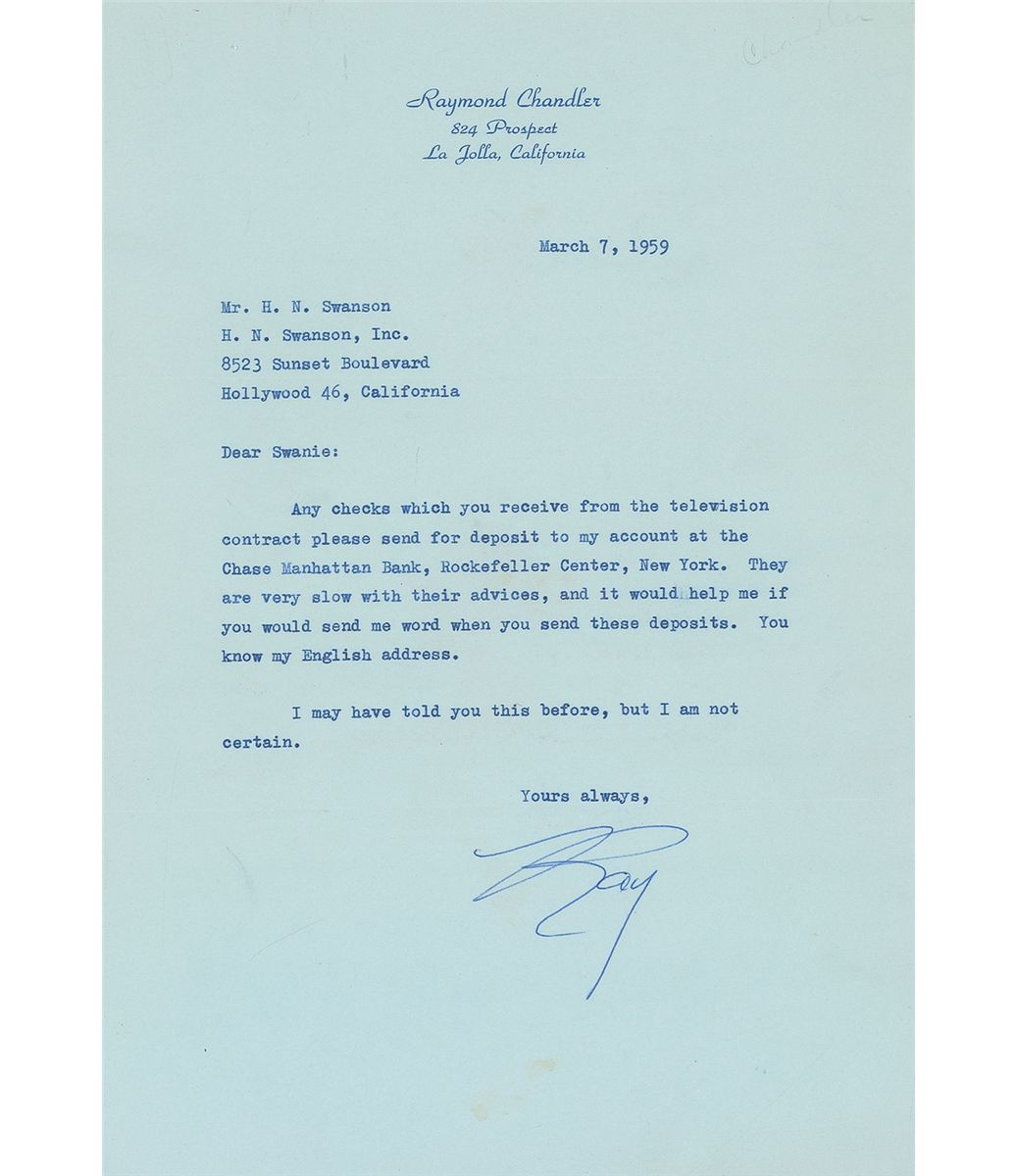 Detective novelist (1888–1959) best known for The Big Sleep and The Long Goodbye. TLS signed “Ray,” one page, 7.25 x 10.5, personal letterhead, March 7, 1959. Letter to his agent H. N. Swanson. In part: “Any checks which you receive from the television contract please send for deposit to my account at the Chase Manhattan Bank.” In fine condition, with staple holes to upper left and a subtle stain near the bottom. Chandler passed away just two weeks later on March 26; a TV series based on his most famous character, Philip Marlowe, would debut on ABC in October 1959, lasting 26 episodes.