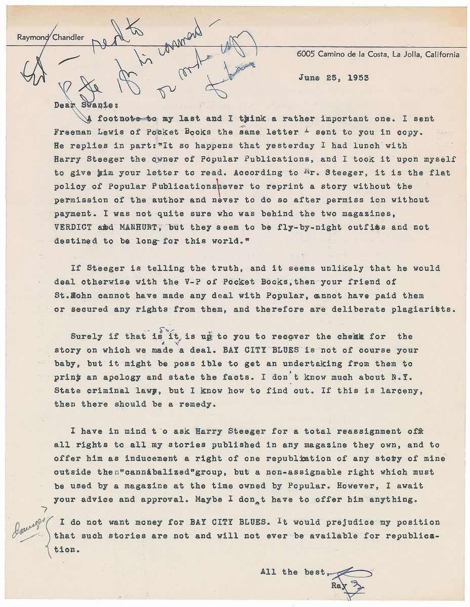 TLS signed “Ray,” one page, 8.5 x 11, personal letterhead, June 25, 1953. Letter to “Swanie,” his agent H. N. Swanson, concerning the plagiarism of his work, in part: “Surely if that is so, it is up to you to recover the check for the story on which we made a deal. Bay City Blues is not of course your baby, but it might be possible to get an undertaking from them to print an apology and state the facts. I don’t know much about N. Y. state criminal law, but I know how to find out. If this is larceny, then there should be a remedy. I have in mind to ask Harry Steeger for a total reassignment of all rights to all my stories published in any magazine they own, and to offer him as inducement a right of one republication of any story of mine outside the ‘cannibalized’ group, but a non-assignable right which must be used by a magazine at the time owned by Popular. However, I await your advice and approval. Maybe I don’t have to offer him anything.” Chandler makes a few handwritten corrections to the text, and the upper right bears ink notations in another hand. In fine condition.