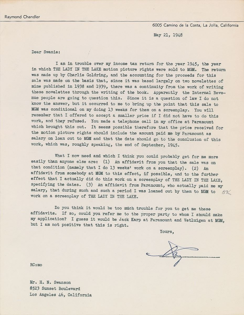 TLS signed “Ray,” one page, 8.5 x 11, personal letterhead, May 21, 1948. Letter to his agent H. N. Swanson, in part: “I am in trouble over my income tax return for the year 1945, the year in which THE LADY IN THE LAKE motion picture rights were sold to MGM. The return was made up by Charlie Goldring, and the accounting for the proceeds for this sale was made on the basis that, since it was based largely on two novelettes of mine published in 1938 and 1939, there was a continuity from the work of writing these novelettes through the writing of the book. Apparently the Internal Revenue people are going to question this. Since it is a question of law I do not know the answer, but it occurred to me to bring up the point that this sale to MGM was conditional on my doing 13 weeks for them on a screenplay. You will remember that I offered to accept a smaller price if I did not have to do this work, and they refused. You made a telephone call in my office at Paramount which brought this out. It seems possible therefore that the price received for the motion picture rights should include the amount paid me by Paramount as salary on loan out to MGM and that the date should go to the conclusion of this work, which was, roughly speaking, the end of September, 1945.” In fine condition.
