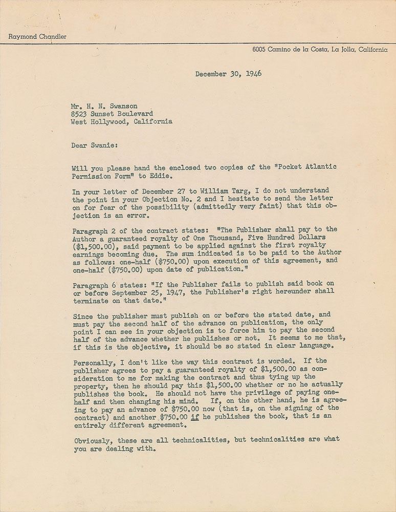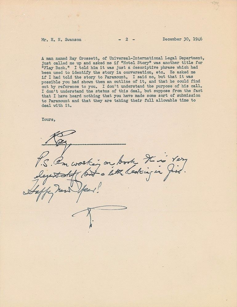 TLS signed “Ray,” two pages, 8.5 x 11, personal letterhead, December 30, 1946. Letter to his agent H. N. Swanson, in part: "Since the publisher must publish on or before the stated date, and must pay the second half of the advance on publication, the only point I can see in your objection is to force him to pay the second half of the advance whether he publishes or not. It seems to me that, if this is the objective, it should be so stated in clear language…Obviously, there are all technicalities, but technicalities are what you are dealing with. A man named Ray Crossett, of Universal-International Legal Department, just called me up and asked me if 'Hotel Story' was another title for 'Play Back.' I told him it was just a descriptive phrase which had been used to identify the story in conversation, etc. He asked me if I had told the story to Paramount. I said no, but that it was possible you had shown them an outline of it, and that he could find out by reference to you." At the conclusion, he adds a three-line autograph postscript, signed "R.," in full: "P.S. Am working on book. It is very elegant stuff but a little lacking in fire. Happy New Year!" In fine condition. Chandler's "Playback" screenplay was ultimately rejected, but he reworked the story into a 1958 book of the same title—his last completed novel.
