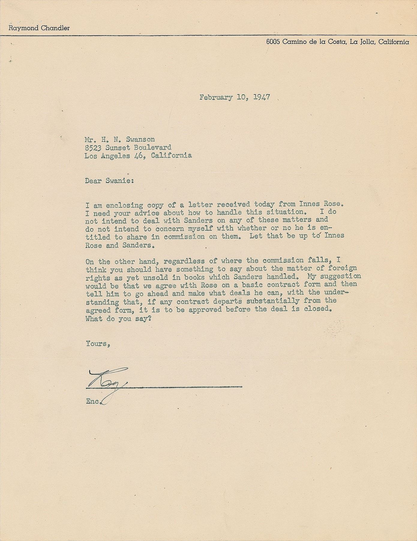 TLS signed “Ray,” one page, 8.5 x 11, personal letterhead, February 10, 1947. Letter to "Swanie," his agent H. N. Swanson, in part: "I am enclosing copy of a letter received today from Innes Rose. I need your advice about how to handle this situation. I do not intend to deal with Sanders or any of these matters and do not intend to concern myself with whether or no he is entitled to share in commission on them. Let that be up to Innes Rose and Sanders. On the other hand, regardless of where the commission falls, I think you should have something to say about the matter of foreign rights as yet unsold in books which Sanders handled." In fine condition.