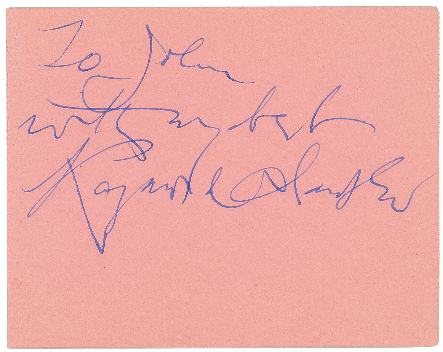 Vintage fountain pen signature and inscription, "To John, with my best, Raymond Chandler,” on a pink 5.5 x 4.25 album page. In fine condition.