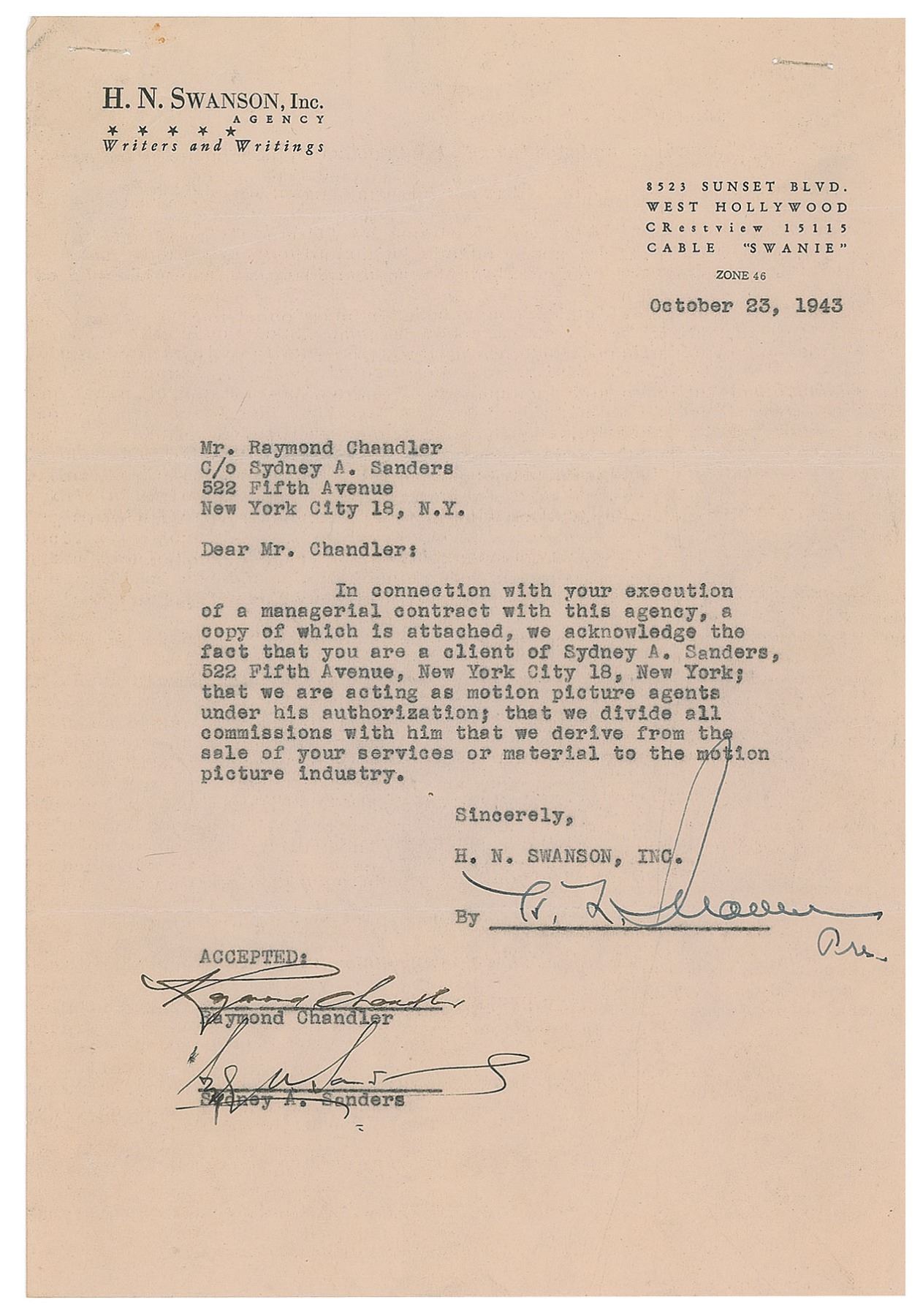 DS, one page, 7.25 x 10.5, October 23, 1943. Official letter from H. N. Swanson, Inc., addressed to Raymond Chandler, in full: "In connection with your execution of a managerial contract with this agency, a copy of which is attached, we acknowledge the fact that you are a client of Sydney A. Sanders, 522 Fifth Avenue, New York City 18, New York; that we are acting as motion picture agents under his authorization; that we divide all commission with him that we derive from the sale of your services or material to the motion picture industry." Signed at the conclusion in fountain pen by Chandler, and countersigned by Swanson and Sanders. In very good to fine condition, with creasing and staple holes to the top.