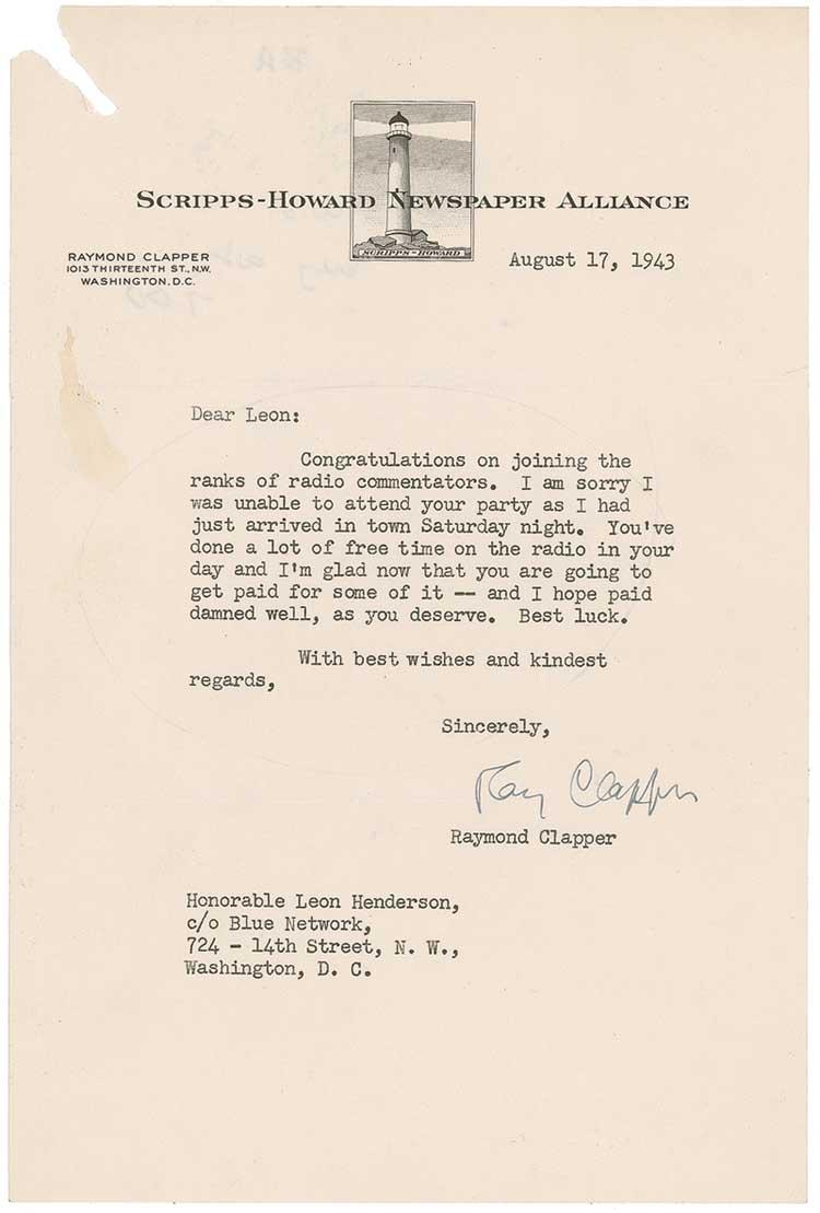 Washington Post writer who was killed in World War II when the navy fighter-bomber carrying him broke formation in order to give him a better view of the bombed airfield and collided with another plane in the air. TLS signed “Ray Clapper,” one page, 6 x 9, Scripps-Howard Newspaper Alliance letterhead, August 17, 1943. Letter of congratulations to Leon Henderson. In part: “Congratulations on joining the ranks of radio commentators…I’m glad now that you are going to get paid for some of it—and I hope paid damn well, as you deserve.” In fine condition, with torn staple holes to top left, vertical crease to left edge, and a bit of light soiling. Pre-certified PSA/DNA and RRAuction COA.