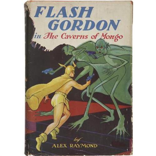 <B>Alex Raymond. </B></I><B><I>Flash Gordon in the Caverns of Mongo</B></I></B></I><B>.</B></I> New York: Grosset & Dunlap, 1936. <BR>First edition. Octavo. 218 pages. Jacket art and pictorial endpapers by Robb Beebe.<BR><BR>Publisher's original orange cloth with titles in black on the spine and front board. Top edge blue. Light shelf wear with slight abrasion to corners. Contents slightly toned, else tight. Dust jacket with some wear at the edges and a few small closed tears and chips, especially at the head and foot of the spine. White areas show shelf wear. Very good. <I>From the Robert and Diane Yaspan Collection.</B></I><BR><BR><b>Shipping:</b> Books & Catalogs (<a target="_blank" href="http://www.heritageauctions.com/common/shipping.php">view shipping information</a>)