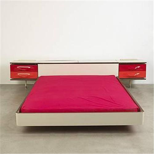 Raymond Loewy DF-2000 bed Compagnie d'Esthetique Industrielle (C.E.I.) France, c. 1960 plastic, laminate 98"w x 93"d x 20"h Bed is flanked by four drawers, two doors concealing storage in back, and two lights.