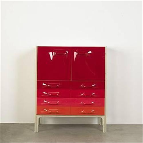 Raymond Loewy DF-2000 cabinet Compagnie d'Esthetique Industrielle (C.E.I.) France, c. 1960 plastic, laminate, enameled aluminum 41"w x 22"d x 49.5"h Featuring six drawers and two doors concealing two adjustable shelves. Label to interior on one drawer.