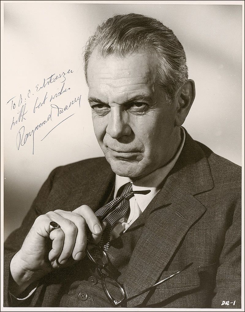 Matte-finish 7.5 x 9.5 photo, signed and inscribed in black ballpoint “To A. C. Erlstoeszer, with best wishes, Raymond Massey.” In fine condition, with a light horizontal crease to upper portion of image.