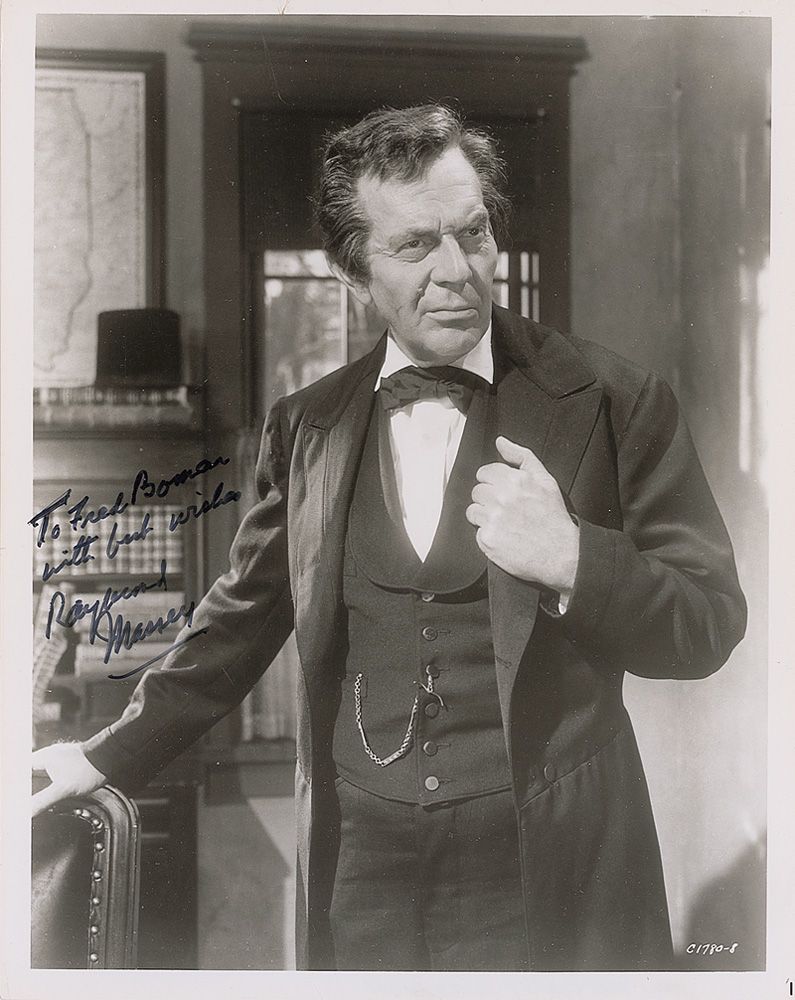 Glossy 8 x 10 photo of Massey as Abraham Lincoln, signed and inscribed in black felt tip “To Fred Boman with best wishes, Raymond Massey.” In fine condition, with some scattered light creases.