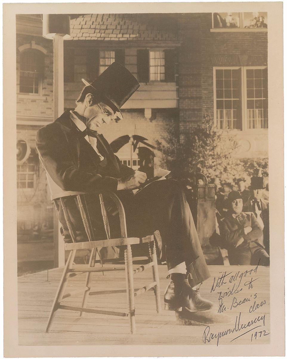Two items: a program for a 1939 performance of Robert E. Sherwood’s Abe Lincoln in Illinois, 8.75 x 12, 12 pages, signed on the front cover in fountain pen; and a matte-finish 8 x 10 photo of Massey on stage as Lincoln, signed and inscribed in black ballpoint, “With all good wishes to Mr. Bean’s class, Raymond Massey, 1972.” In overall fine condition, with slight creasing to left edge and scattered rubbing and light soiling to covers of the program. Accompanied by an unsigned broadside for the play, promoting its two-week run beginning on October 23, 1939. Massey earned a Best Actor Oscar nomination for his reprisal of the role in John Cromwell’s 1940 film adaptation.