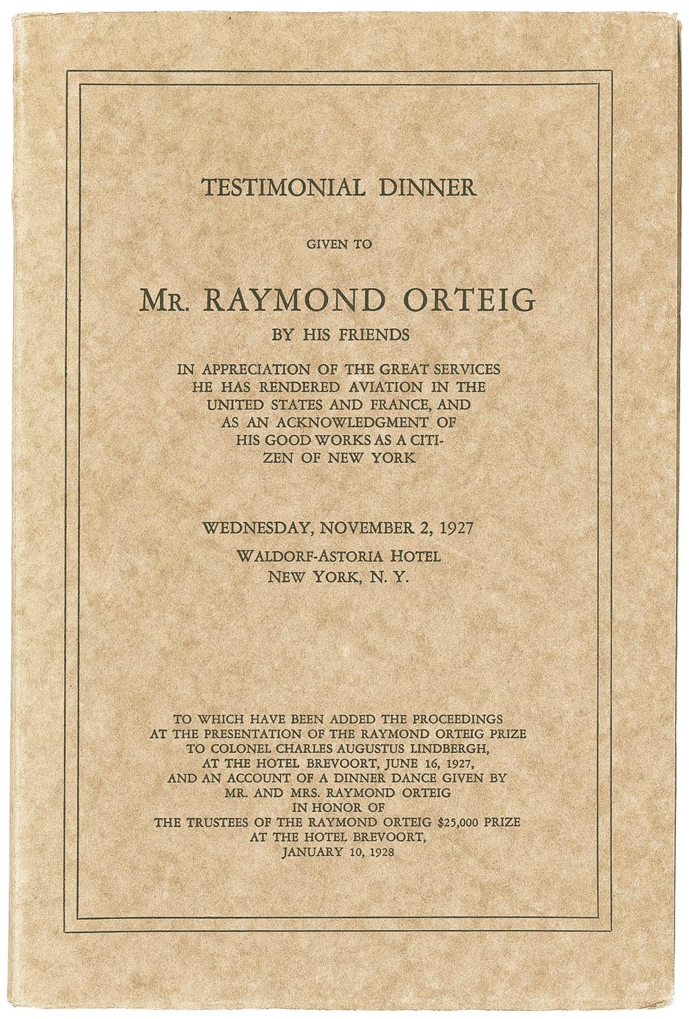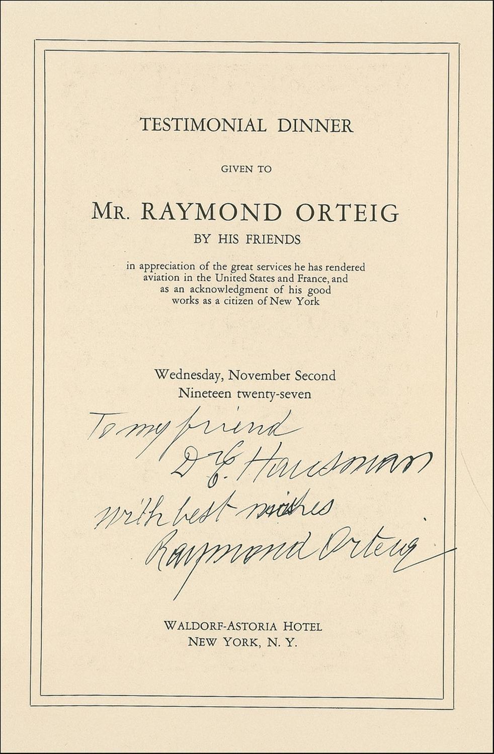 Significant New York City hotel owner who offered the Orteig Prize of $25,000 in 1919 for the first non-stop transatlantic flight, in either direction, between New York and Paris. Extremely rare vintage program from a testimonial dinner given to Orteig “by his friends in appreciation of the great services he has rendered aviation in the United States and France, and as an acknowledgment of his good works as a citizen of New York,” held at the Waldorf-Astoria on November 2, 1927, 6.25 x 9.5, 66 pages. Signed and inscribed inside “To my friend Dr. E. Hausman, with best wishes, Raymond Orteig” opposite a full-page photo of Orteig and Charles Lindbergh stiffly posing together. In fine condition, with mild page toning, and light wear to hinge along signed page. Accompanied by a letter of provenance from the grandson of the signature’s original recipient.