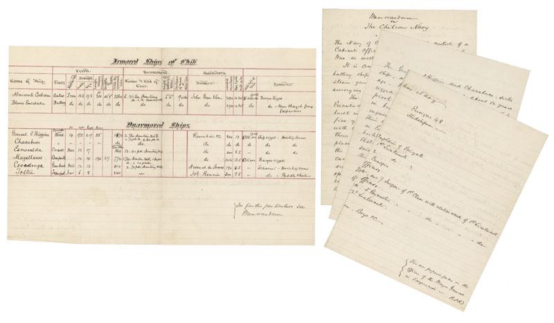 RAYMOND P. RODGERS (1849-1925) U.S. Naval officer who served as the Head of the Office of Naval Intelligence. Autograph “Memorandum on the Chilean Navy” Signed, “R.P. Rodgers.” Seven pages, 7 3/4” x 9 3/4”. Accompanied by a one page 15 3/4” x9 3/4 ledger of armored and unarmored ships of Chile. Rodgers writes, in part: “ … The Navy of Chile is under the control of a Cabinet Officer … It is composed of two armored central battery ships, four steam corvettes, one steam gun-vessel, and one transport and surveying vessel. The Almivante Cochrane and the Blanco Eucalada, the two armored vessels, were built in England by John Peen & Sons about five years ago. They are broadsided vessels with central batteries. Their guns, of which there are six 12 1/2 ton … so placed to fire around the entire horizon. They are barque rigged, carry a considerable spread of canvas … These ships are built of iron, with double bottoms …. Their batteries are protected on the sides by 7 inches of armor … Their guns are placed in the battery so that two may be fired directly ahead, or so that three may be fired simultaneously on either beam … The guns as before mentioned are 12 1/2 M.dR. Armstrongs, mounted on the Scott carriage, and can be fired by electricity. In addition to their gun power these vessels are built for ramming … Their motor power consists of two pair of two-cylinder … trunk engines … each pair of which drives one of the two screw on the steam trial in England a speed of 12.82 knots … The two ships are identically the same, excepting that the Blanco Euculada is sheathed with zinc … The zinc plates have become so much wasted that it is said she will go to San Francisco to be docked … The General Higgins and Chacabuco, sister ships, were built in England about 12 years ago … Their maximum speed on trial in England was 13 knots, but their boilers are now in such a bad condition that the can make but 8 knots … The Esmeralda is an old vessel, built of wood, and has but little speed … The Covadanga, a small gun-vessel, was captured from the Spaniards in 66, and is now undergoing repairs … There is at present no Naval School. The Cadets are instructed at the Military School in Santiago, and after passing their examination are sent on board ship to learn the practical portion of their profession … The information herein collected was obtained from observations and conversation on board the Chilean men of war, they data given in the table, was gathered from the Office of Mayor-General in Valparaiso or on board the different vessels … ” The accompanying 15 3/4” x9 3/4 table, accomplished in Rodger’s hand, provides the following information for each Chilean vessel: “Name of Ship,” “Class,” “Material,” “Draught, Forward and Aft,” “Length between perpendiculars,’ “breadth of beam,” “Total displacement, tons,” “ Number & Kind of Guns,” “ Height of Battery above Water,” “Thickness of Armor at water-line,” “Builders,” “Indicated Horse Power,” “ Max Speed, knots per hour,” “Total cost of ship” and “Remarks.” Verso of this table contains a count of Chilean Naval personnel divided by rank. A great piece of naval history and intelligence gathering during the period between Chile's war with Spain and the Pacific War between Chile and Peru. Extremely Fine.