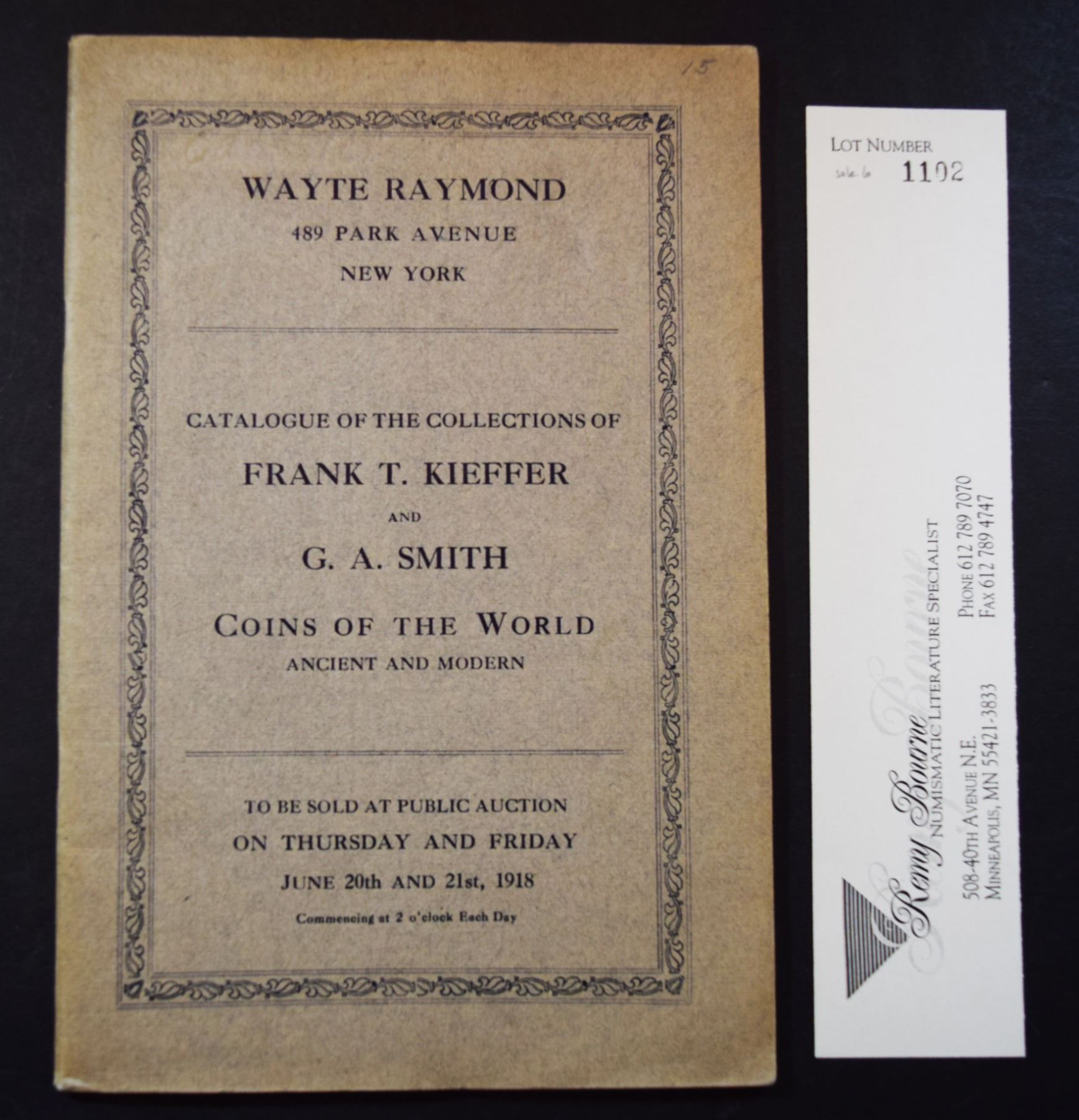 Raymond, Wayte. CATALOGUE OF THE COLLECTIONS OF FRANK T. KIEFFER AND G.A. SMITH. COINS OF THE WORLD. ANCIENT AND MODERN. June 20-21, 1918. 1-1154 Lots. 12mo. This auction sale catalog includes numismatic material from Ancient Greece and Rome, the United States, Latin America, Europe and other foreign countries from the collections of Frank T. Kieffer of Syracuse, N.Y. and G.A. Smith of Brooklyn, N.Y. Included in the sale are United States Coins, Choice Dimes, Half Dimes, Cents and Tokens, Rare Ancient coins including the excessively rare Denarius of Marcus Junius Brutus, Mexican, Central and South American coins, and Spanish & Portuguese Gold Coins. New York: Anderson Galleries, original gray card covers, 48 pages, unplated, ex Remy Bourne Sale No. 6 Lot 1102, Gengerke 6[514]. Lot weight: 0 lbs 3oz. Subject(s): Ancients, United States, European, Latin American, World Coinage.