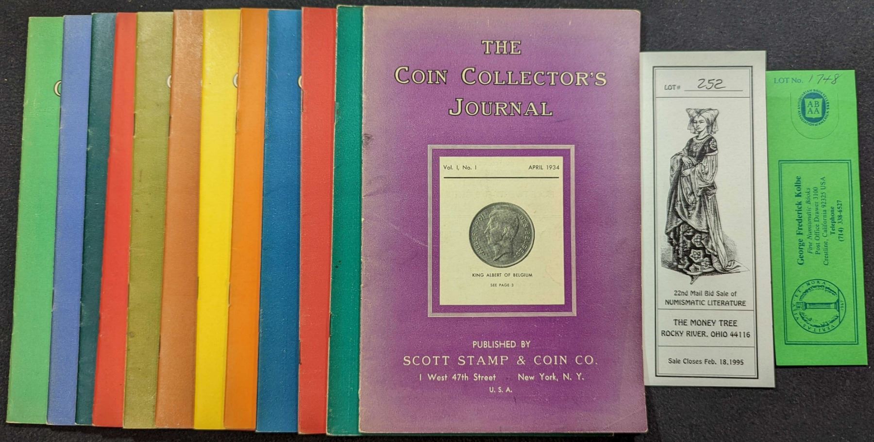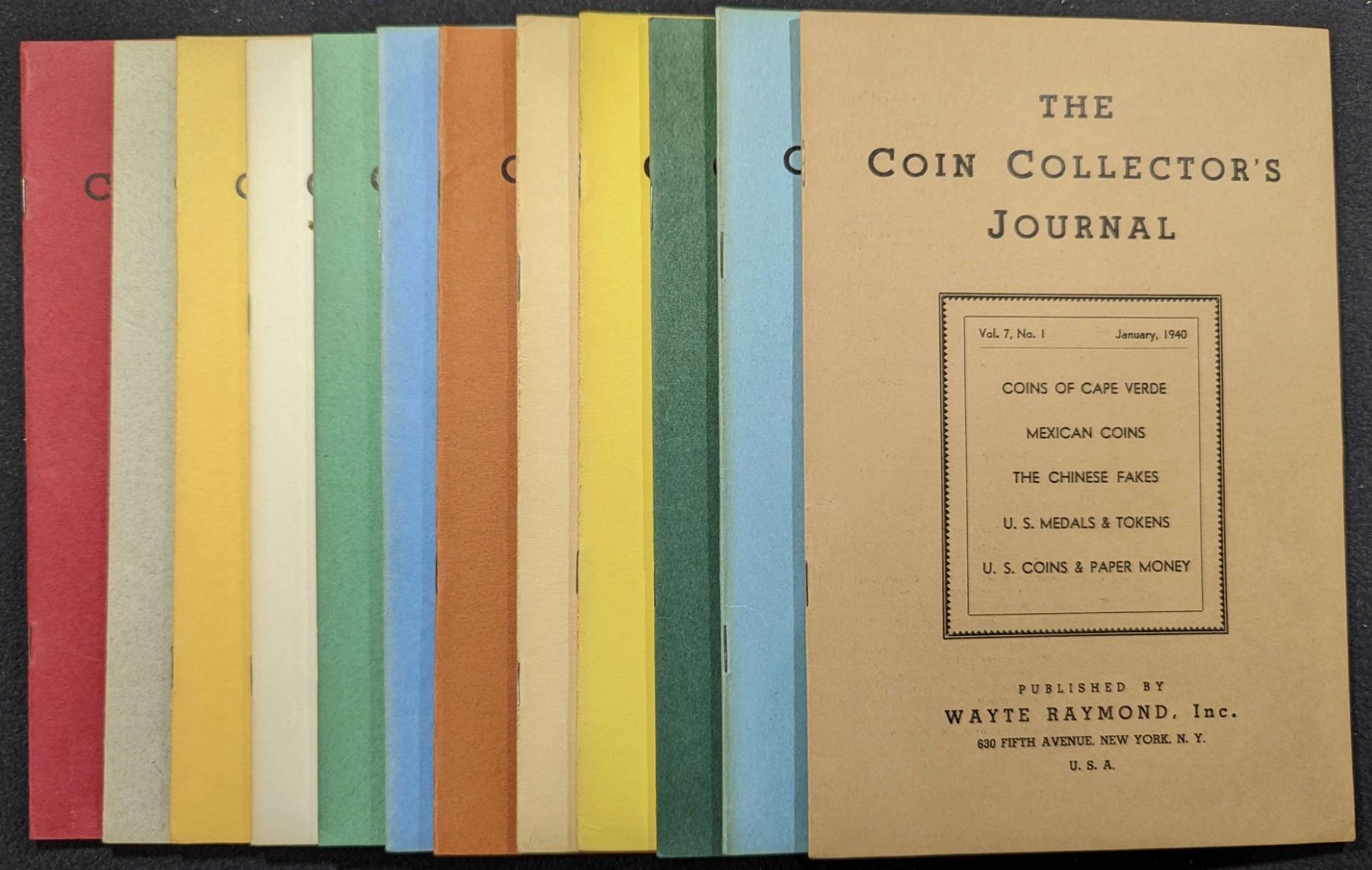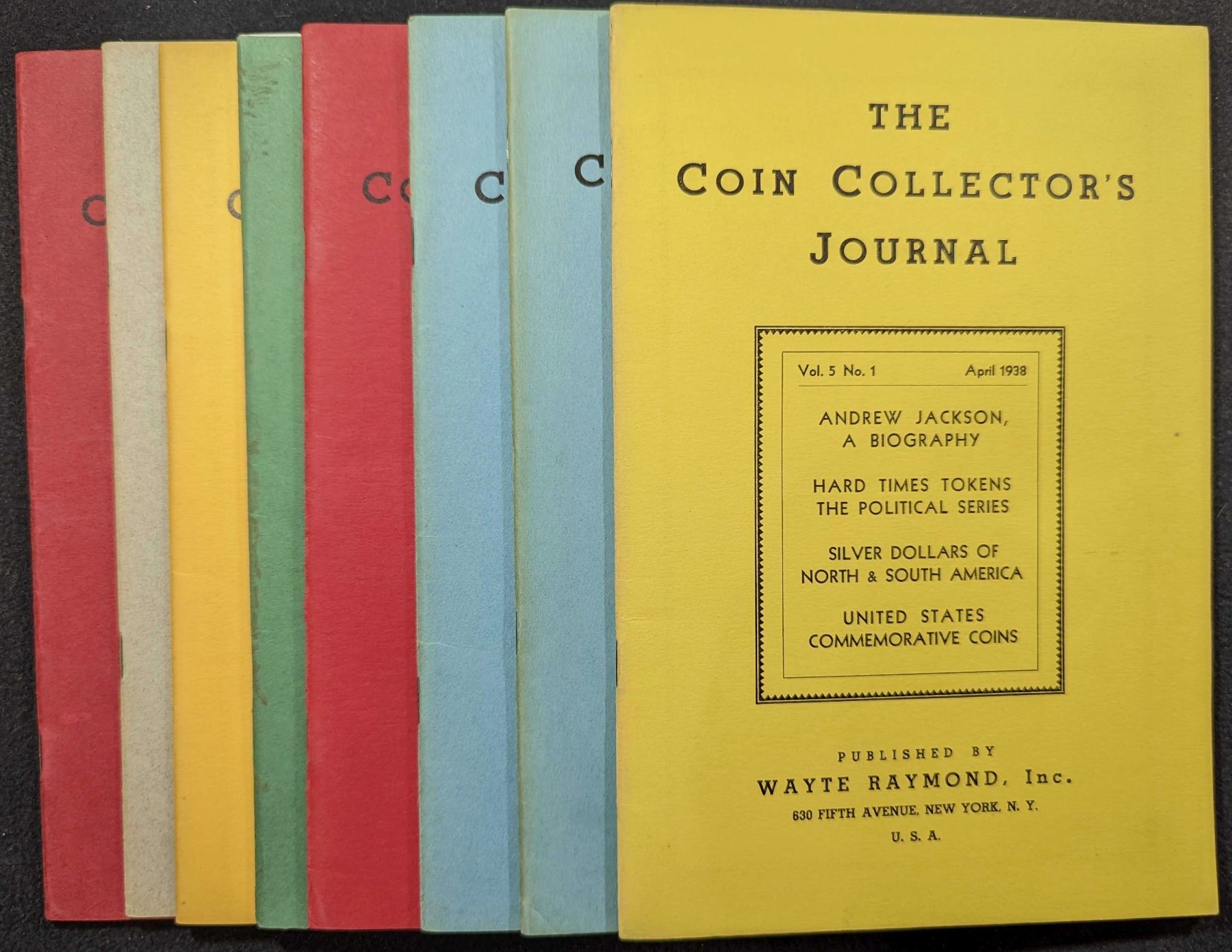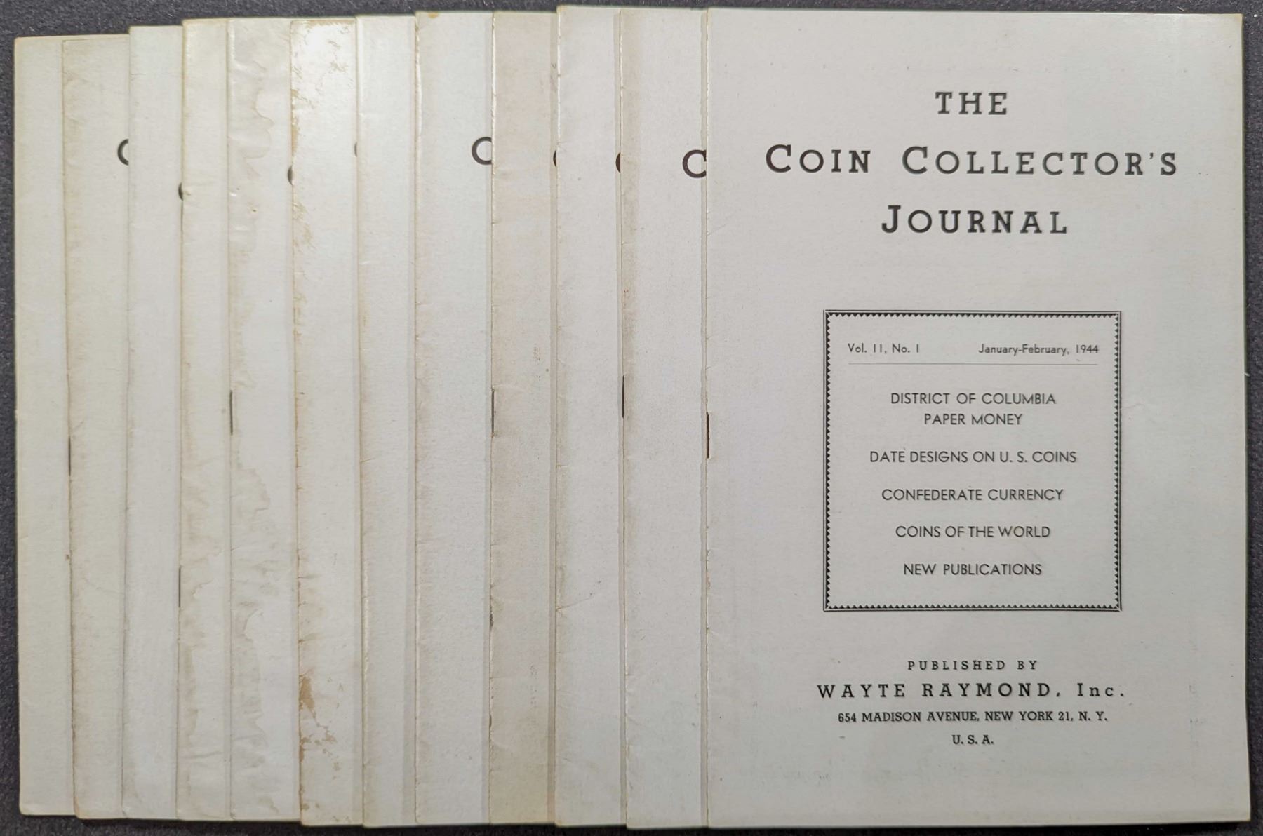 THE COIN COLLECTOR'S JOURNAL. ISSUES 1 TO 160. 1934-1958. Raymond, Wayte. The Coin Collectors Journal. New Series. April 1934, Vol. 1 No. 1, to 1958, Number 160. Volumes 1-21, complete as published in 160 issues [two different issues numbered 116 were published; number 140 was never issued]. New York: Edited by Wayte Raymond, 1934-1958. 3,894 pages, well illustrated. A complete set in the original printed paper or card covers. generally, all Fine. An indispensable source of useful information covering the entire range of numismatics, from ancient coins to then-current United States and foreign issues, and its numerous monographs often provide useful information found nowhere else. Starting with Volume 19 (No. 142), the remaining issues each comprises a stand-alone monograph. A fine set. Clain-Stefanelli 485. ex Kolbe unknown sale lot 1748. ex Money Tree Sale No. 22 lot 252. Lot weight: 18 lbs 4oz. Subject(s): United States, Ancient, World Coinage, Paper Money, and Medals.