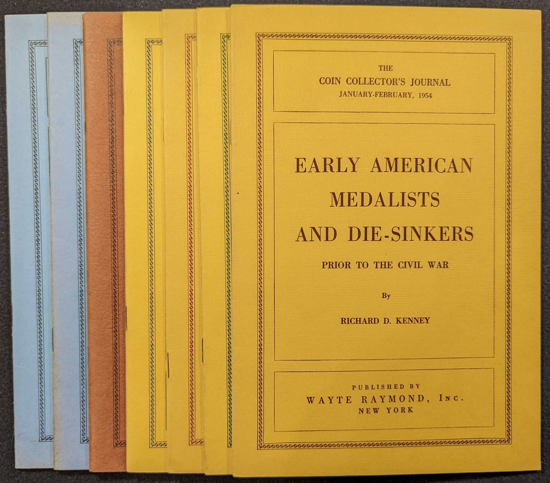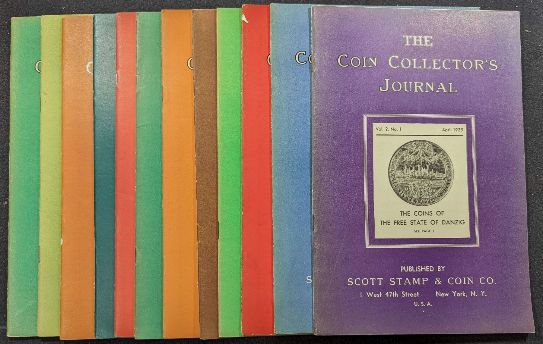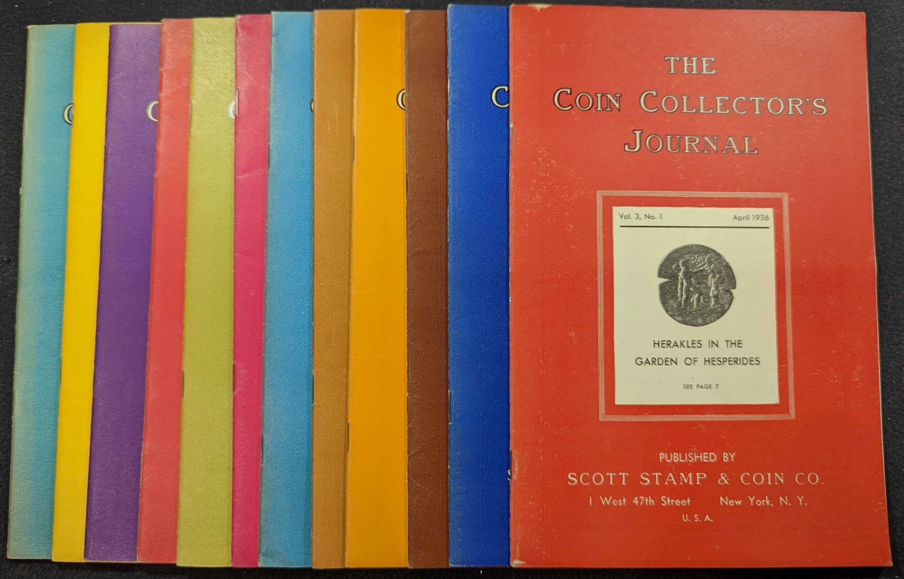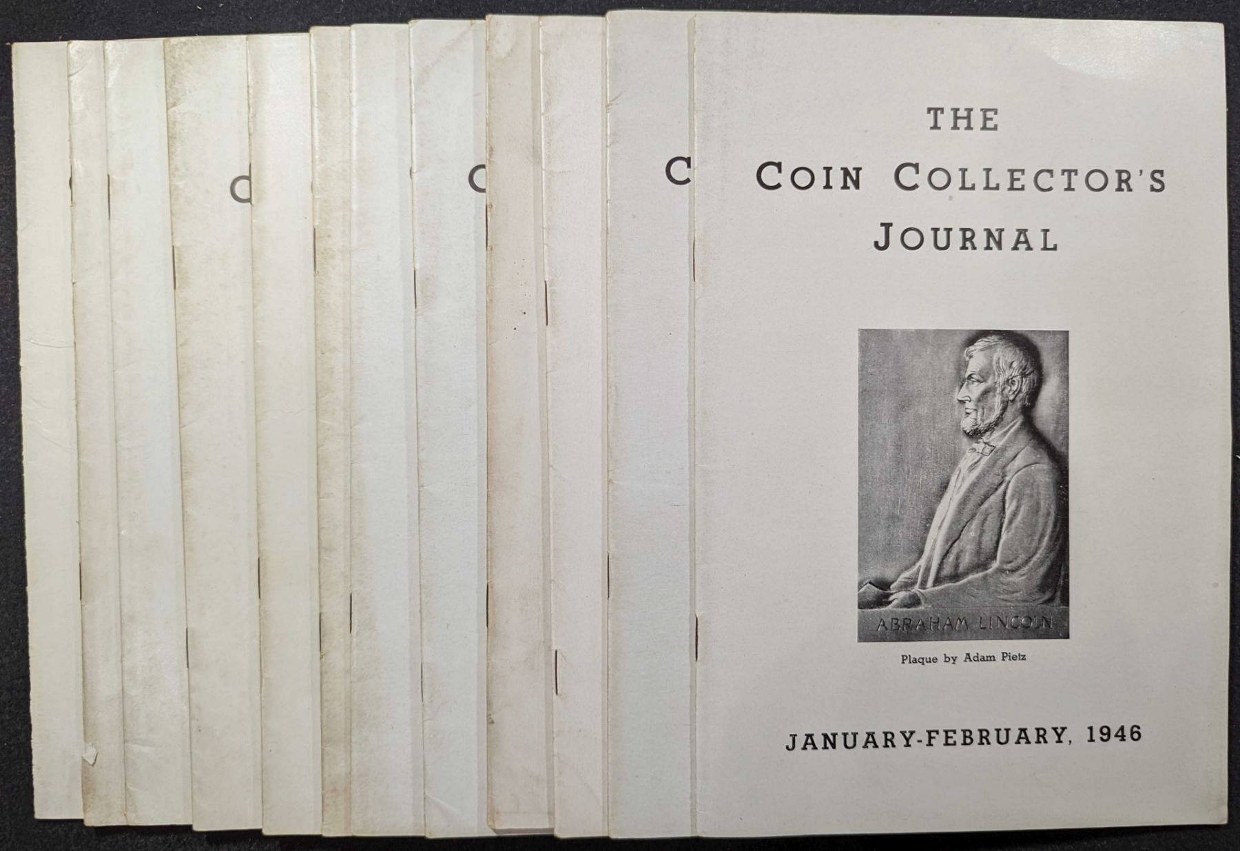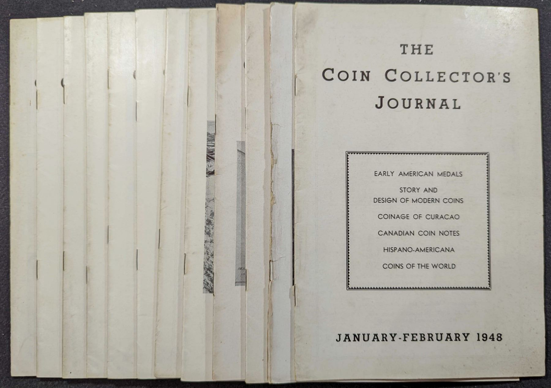 THE COIN COLLECTOR'S JOURNAL. ISSUES 1 TO 160. 1934-1958. Raymond, Wayte. The Coin Collectors Journal. New Series. April 1934, Vol. 1 No. 1, to 1958, Number 160. Volumes 1-21, complete as published in 160 issues [two different issues numbered 116 were published; number 140 was never issued]. New York: Edited by Wayte Raymond, 1934-1958. 3,894 pages, well illustrated. A complete set in the original printed paper or card covers. generally, all Fine. An indispensable source of useful information covering the entire range of numismatics, from ancient coins to then-current United States and foreign issues, and its numerous monographs often provide useful information found nowhere else. Starting with Volume 19 (No. 142), the remaining issues each comprises a stand-alone monograph. A fine set. Clain-Stefanelli 485. ex Kolbe unknown sale lot 1748. ex Money Tree Sale No. 22 lot 252. Lot weight: 18 lbs 4oz. Subject(s): United States, Ancient, World Coinage, Paper Money, and Medals.