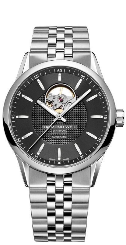 Model: 2710-ST-20021 - CASE = [Material:Stainless Steel], [Case Diameter:42], [Bezel:Fixed], [Case Back:See-thru Sapphire crystal], [Water Resistant:100 Meters - 330 Feet], [Crystal:Scratch Resistant Sapphire], DIAL = [Color:Black Guilloche Center with Visible Window at 12], MOVEMENT = [Type:Automatic Self Winding], BAND = [Clasp:Hidden Folding Deployment], [Type:Stainless Steel], (Usually ships in 1 to 2 weeks.)