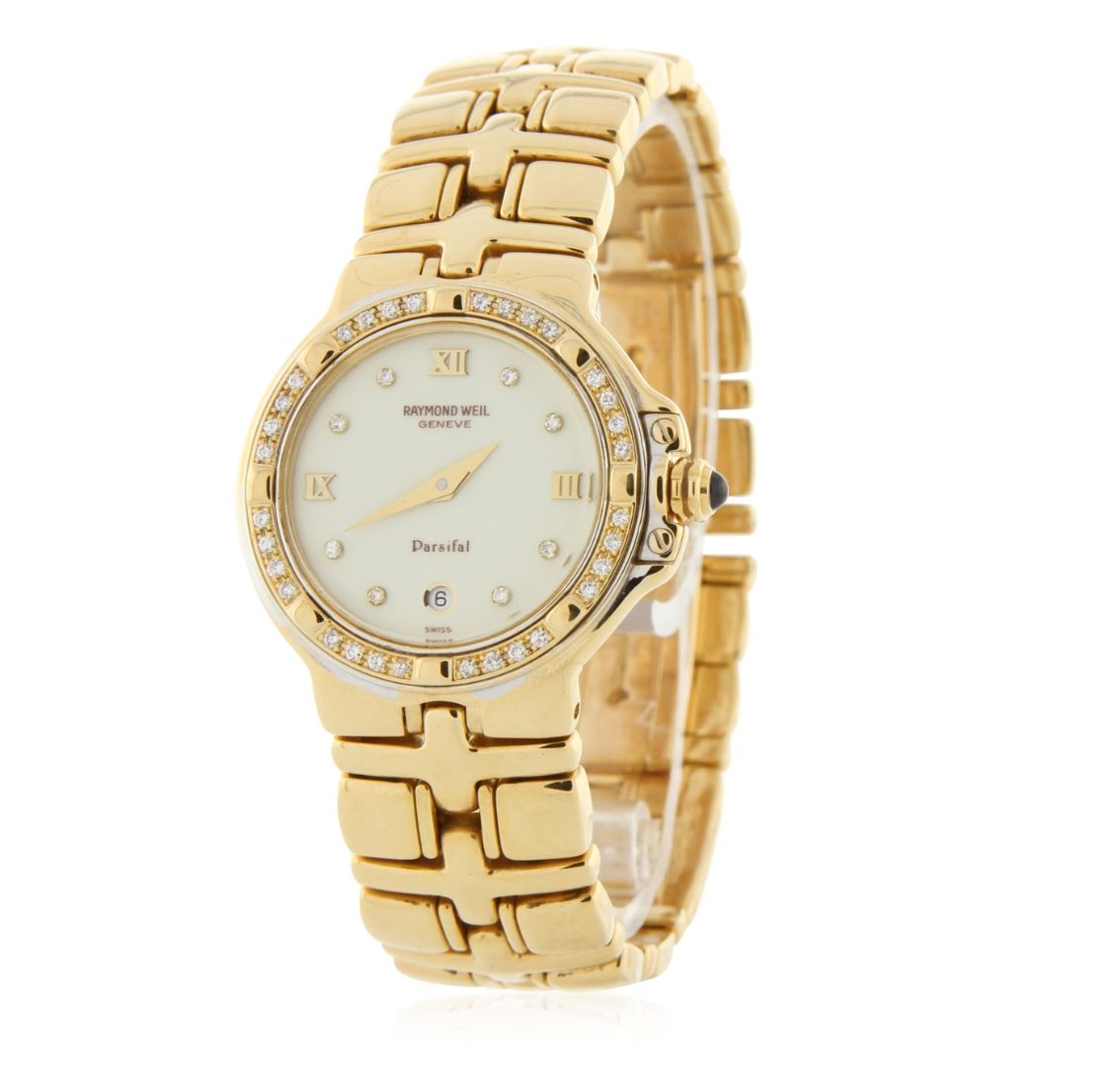 One Raymond Weil Parisfal 18KT Yellow Gold Diamond Wristwatch featuring: Factory Diamond Hour Mark, date at 3 o'clock position, Quartz Movement, Caliber height of 2.65 mm, 18 KT Yellow Gold Case 28 mm in diameter, 6.2 mm high, screwed back, water resistant up to 100 m, 330 ft, 10 atm, sapphire crystal with antiglare treatment, white dial set with diamonds, date window at 6 o'clock, RW logo and lacquer crown, 18KT Yellow Gold Strap, Folding clasp with double push-security system.