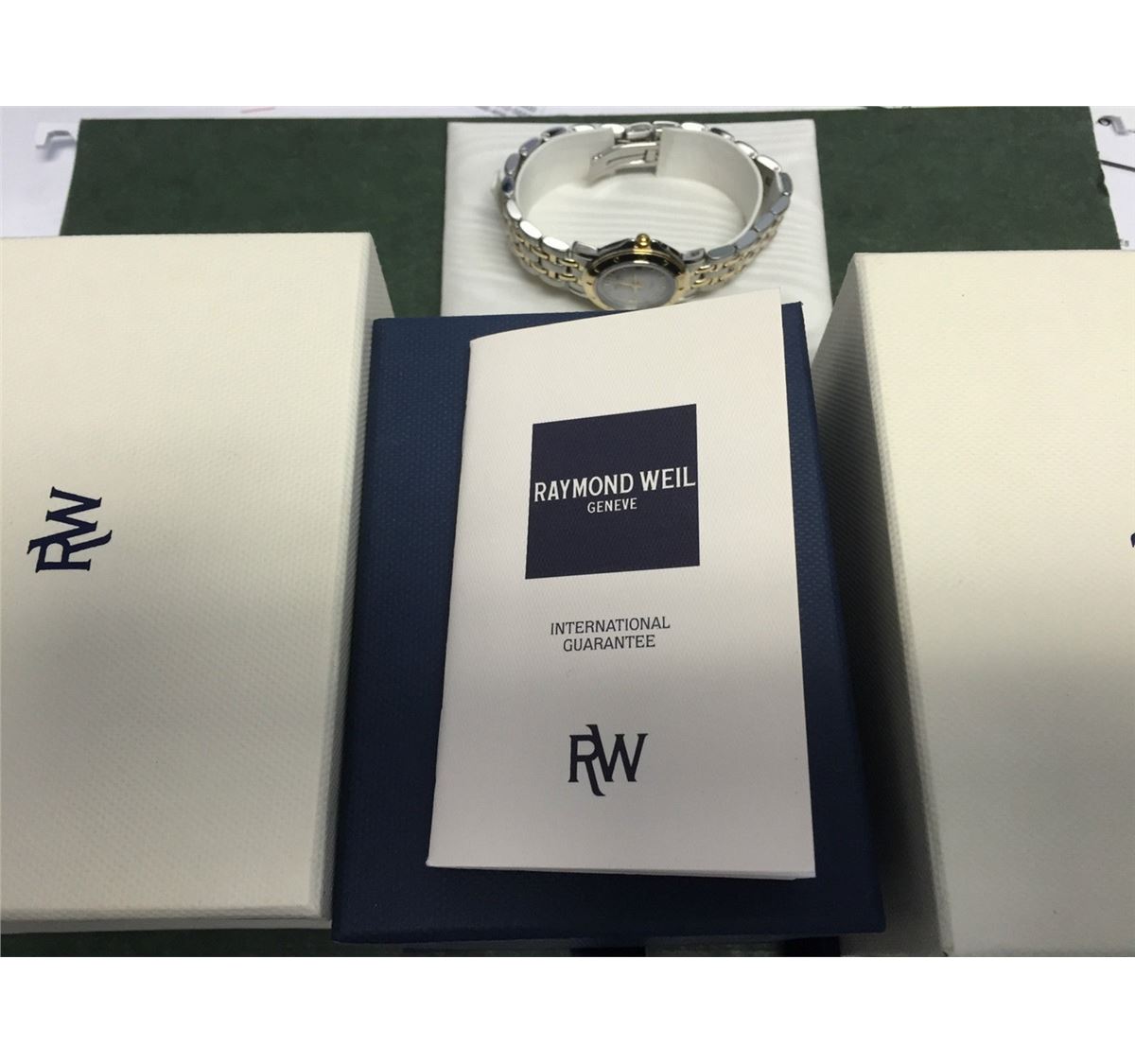 Stainless steel case with a two-tone (silver and gold-tone) stainless steel bracelet. Fixed gold bezel. White dial with gold-tone hands and index hour markers. Minute markers around the outer rim. Dial Type: Analog. Date display at the 3 o'clock position. Quartz movement. Scratch resistant sapphire crystal. Pull / push crown. Solid case back. Case diameter: 28 mm. Round case shape. Band width: 14 mm. Fold over clasp with double push button release. Water resistant at 50 meters / 165 feet. Functions: date, hour, minute, second. Dress watch style. Watch label: Swiss Made. Raymond Weil Tango White dial Two-tone Ladies Watch 5360-TT/WI. Information Brand: Raymond Weil Model: 5360-TT/WI Gender: Ladies Watch Label: Swiss Made Movement: Quartz Case Diameter: 28 mm Crown: Pull / Push Case Shape: Round Case Back: Solid Bezel: Fixed Gold-tone Dial Dial Type: Analog Dial Color: White Crystal: Scratch Resistant Sapphire Hands: Gold-tone Second Markers: Minute Markers around the outer rim Bracelet Band Type: Bracelet Band Material: Two-tone (Silver and Gold-tone) Stainless Steel Band Color: Gold Band Width: 14 mm Clasp: Fold Over with Double Push Button Release Features Water Resistance: 50 meters / 165 feet Calendar: Date display at the 3 o'clock position Functions: Date, Hour, Minute, Second Features: Gold, Stainless Steel All books and boxes included.