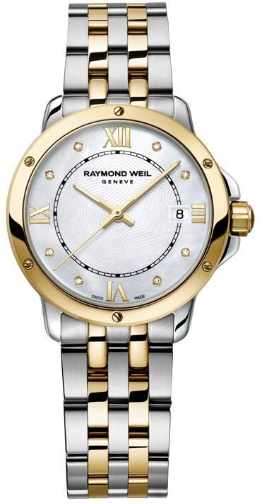 Model: 5391-STP-00995 - CASE = [Material:PVD and Stainless Steel], [Case Diameter:28], [Case Thickness:6.6mm], [Bezel:Fixed], [Case Back:Solid], [Water Resistant:100 Meters - 330 Feet], [Crystal:Scratch Resistant Sapphire], DIAL = [Color:Mother of Pearl], MOVEMENT = [Type:Quartz], [Crown:Push In], BAND = [Clasp:Folding], [Type:Two-Tone Stainless Steel], (Usually ships in 1 to 2 weeks.)