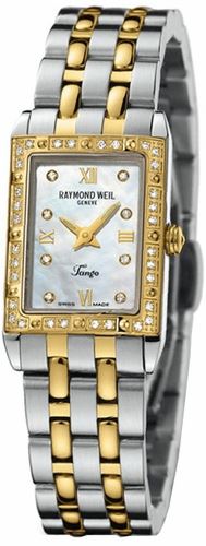 Model: 5971-SPS-00995 - CASE = [Material:Polished 18k Gold Tone and Stainless Steel], [Case Diameter:23], [Bezel:Set with 32 Diamonds], [Case Back:Solid], [Water Resistant:50 Meters / 165 Feet], [Crystal:Scratch Resistant Sapphire], DIAL = [Color:White Mother of Pearl Roman Numeral Set with 8 Diamonds], MOVEMENT = [Type:Battery Powered Quartz], BAND = [Clasp:Hidden Folding], [Type:18k Gold Tone and Stainless Steel], (Usually ships in 1 to 2 business days.)