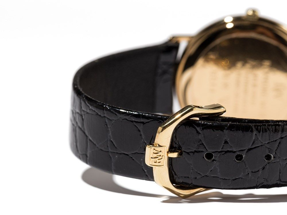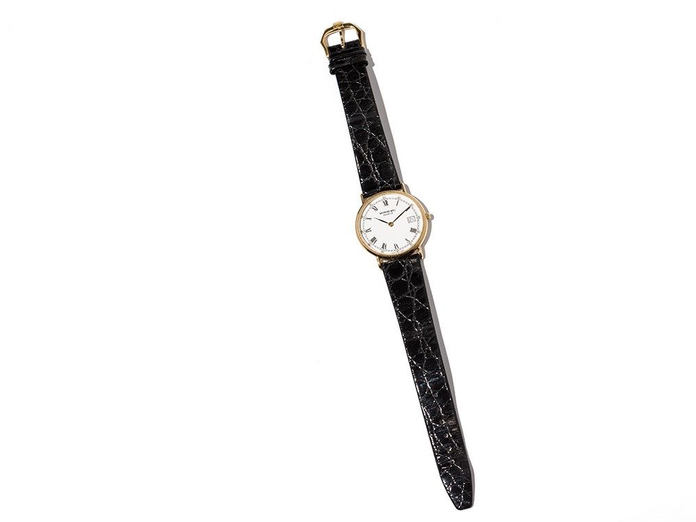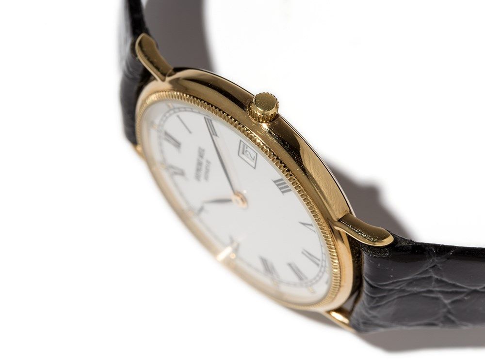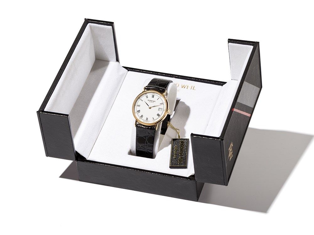 The present Raymond Weil watch was manufactured ??around 1991 in Switzerland. It is fitted with a quartz movement caliber ETA 955 414 with seven jewels, and shows the hour, minute and date. The white dial is fitted with black hands. The casing is made of gold-plated stainless steel. The black leather strap has a gold-plated pin buckle.