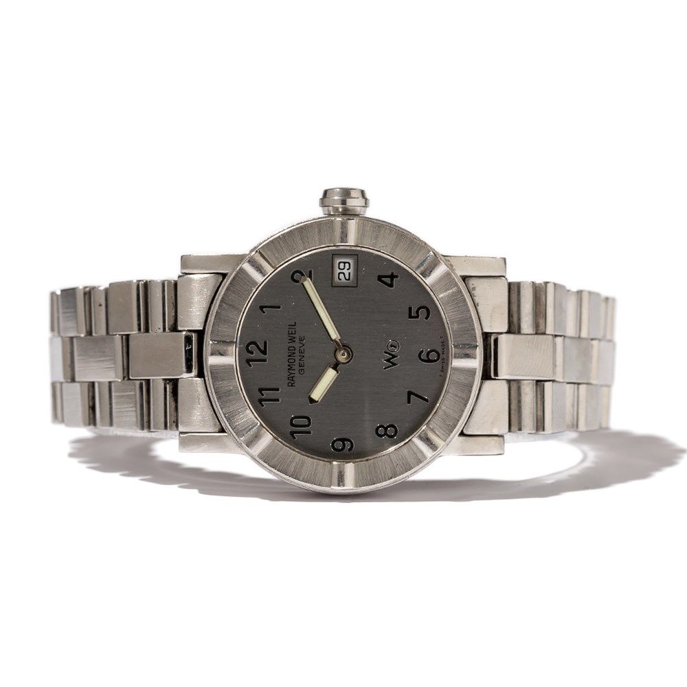 The present Raymond Weil watch was made ??around 1995 in Switzerland. It has a quartz movement, and displays the hour, minute and date. It has a gray dial and silver, luminous hands. The watchcase, strap and folding clasp are made ??of stainless steel.