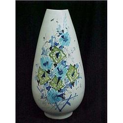 Hand painted ceramic vase in pear form, with blue, green and black abstract floral decoration on front, signed on bottom R.610/B Raymor, Italy