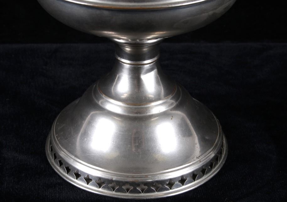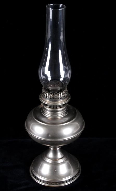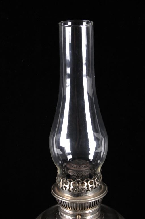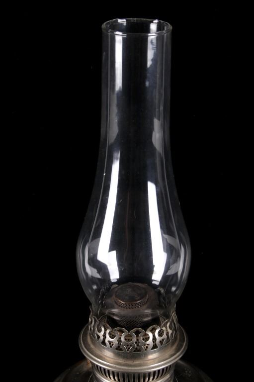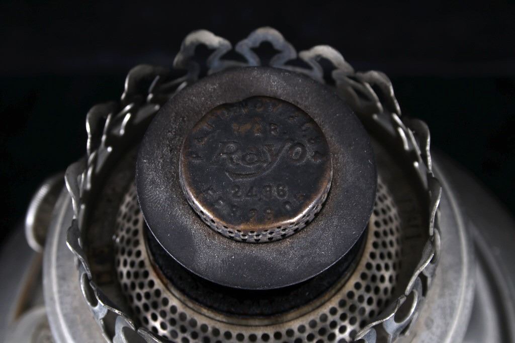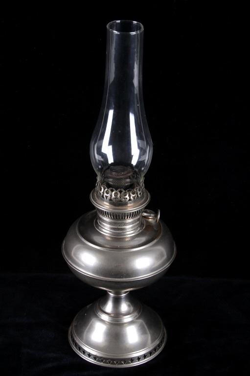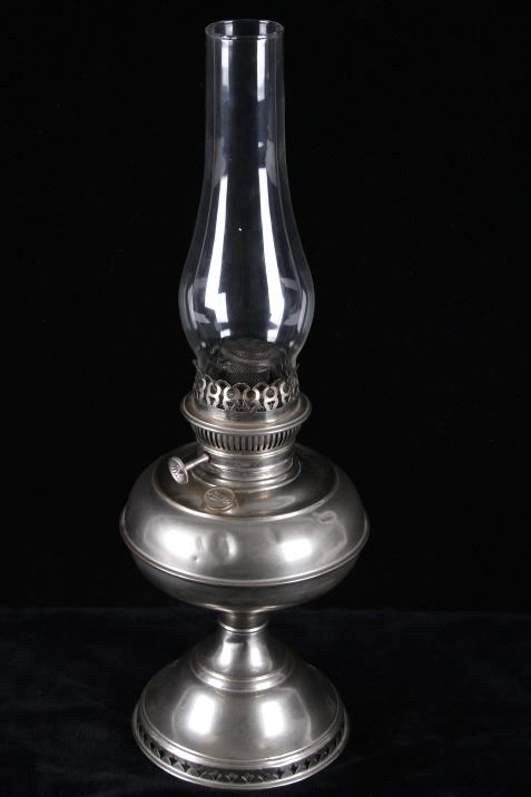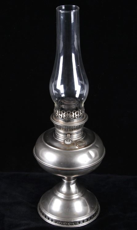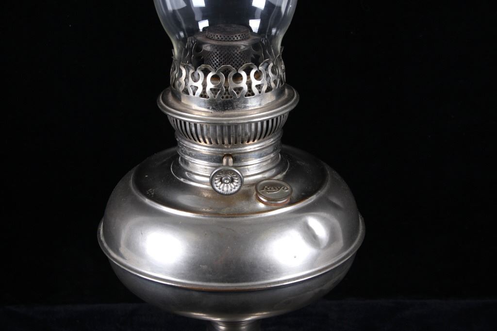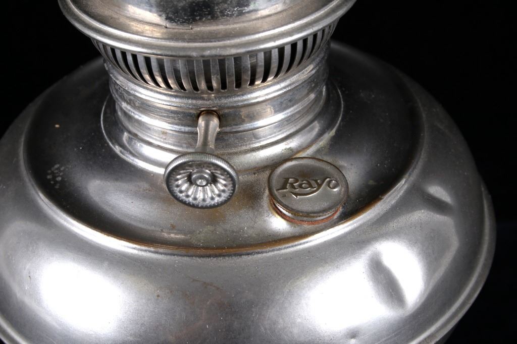 Featured in this lot is this Rayo nickel kerosene table lamp circa 1894-1905. This is a wonderfully and professionally crafted nickel construction that features a circular wick with a art deco neck that attaches to a glass flute. The lamp is marked 'Rayo' on the lid to the kerosene compartment and is marked on the top of the grate 'Pat'd Nov 20, 1894 - Rayo - serial number: 2436 - Feb. 28, 1905.' The condition of this kerosene lamp is good with some slight dings to the nickel body of the lamp but otherwise shows good overall condition. The measurements of this kerosene lamp is 21" x 7" x 7" with the flute on.