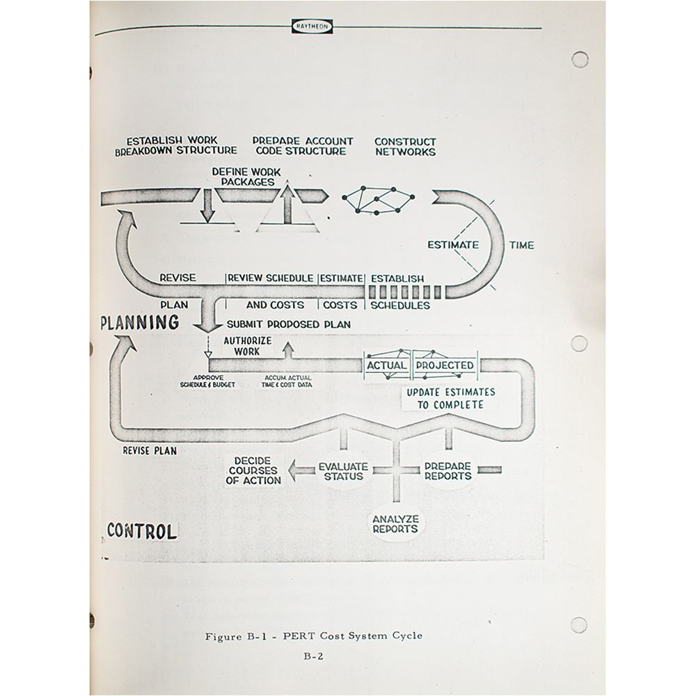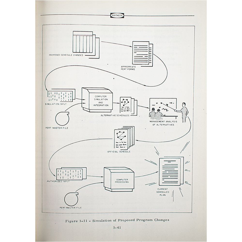 Official bracket-bound manual entitled ‰ÛÏMissile Systems Division, PERT Systems: A Guide for Operating Management,‰Û (BR-2610) prepared by the Raytheon Company of Bedford, Massachusetts, 193 total pages, 9 x 11.5, circa late 1963, with spine marked ‰ÛÏPERT‰Û and front cover label reading: ‰ÛÏMissile Systems Division, PERT Systems.‰Û The manual contains four main sections‰ÛÒIntroduction, MSD PERT Policy, PERT Time System Description, PERT Cost System Description‰ÛÒ and three appendixes: Glossary of Terms, PERT Operating Procedures, and PERT Cost Output Reports, the latter of which is a direct copy of the March 1963 preliminary issue of ‰ÛÏSupplement No. 1 to DOD and NASA Guide.‰Û The close of the introduction states: ‰ÛÏThe computer program discussed is the IBM 7090 PERT/COST Program, 7090-CP-01X version 1 modification level 2.‰Û NASA used 7090s, and, later, 7094s to control the Mercury and Gemini space flights. Goddard Space Flight Center operated three 7094s and, during the early Apollo Program, a 7094 was kept operational to run flight planning software that had not yet been ported to mission control's newer System/360 computers. In fine condition.