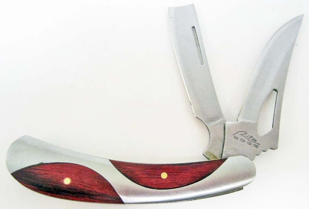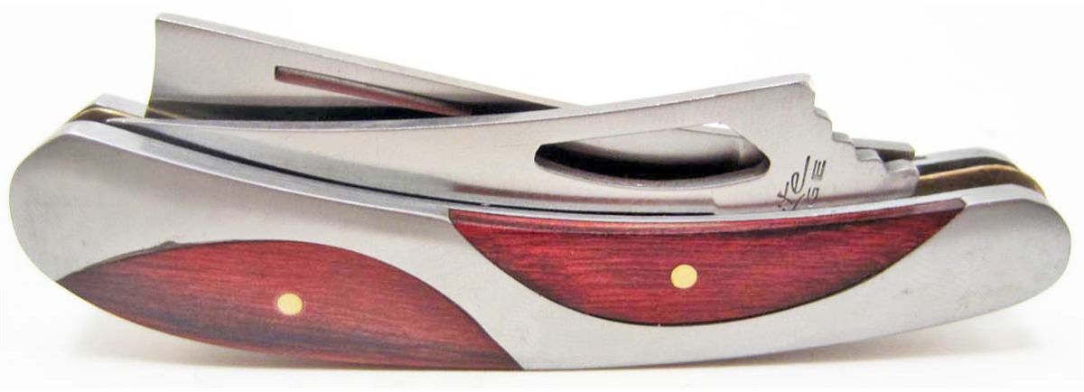 3 1/2" closed. Stainless razor blade and skinner blade with thumb slot pull. Brushed stainless frame with rich wood grain inlays.