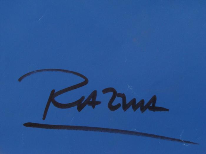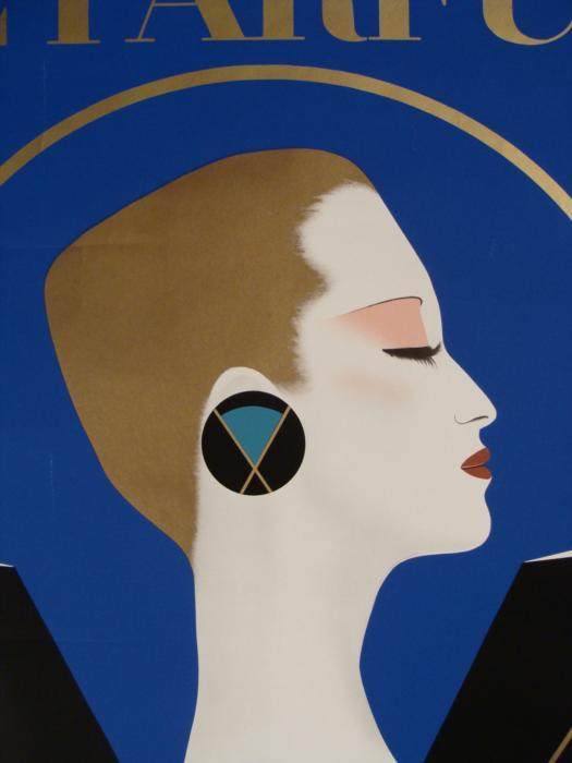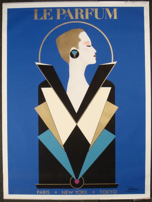This perfume poster has a splendid elegant Art Deco design, and modern style. Artist: RazziaTitle: Le ParfumSignature: By the artist in black marker, lower rightMedium: Print on paperSheet size: 47 x 62 inchesDate: 1984Condition: Very good; a few slight edge tears and crease marks on the image, but nothing very noticeableAnyone who loves Erte and Deco style will love to have this signed Razzia poster on their wall.