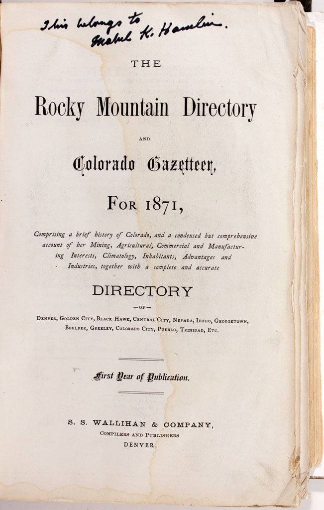 1871 - This 6.5" x 9.5" x 1.75" volume contains the 1871 Rocky Mountain Directory in new binding. The front page of the directory has been stamped "Otto M Blake/ Black Hawk Livery" in two places. The title page indicates that 1871 is the "First Year of Publication" of this directory, compiled and published by S.S. Wallihan & Company of Denver, CO. This directory includes 442 numbered pages and additional leaves of ads in the beginning and rear of this bound volume. Illustrations include ads for sulkies (small carts) and other buggies, a full-page ad for the "Phelps Process" for treating refractory gold, St. Louis Chemical works, and many others. The directory itself includes descriptive passages on history, geography, diverse counties, inhabitants, and businesses through the states of Colorado, Nevada, Idaho, and others--with special focus on Colorado. Extensive sections also include discourse on mining operations throughout the state of Colorado. Although this directory has been rebound, and many of its page corners are folded, stained, or torn, this is a fascinating item from the early 1870s. -61532
