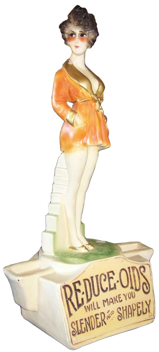 Re-Duce Oids Plaster Store Display Figure. Property of Scientific Labs of America. In the Art Deco Style this is a stunning figure with original patina and Bright Colors. Some miner chipping to the paint but does not distract from the beauty. Very Good Condition. 19 Inches tall.