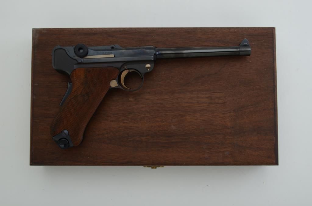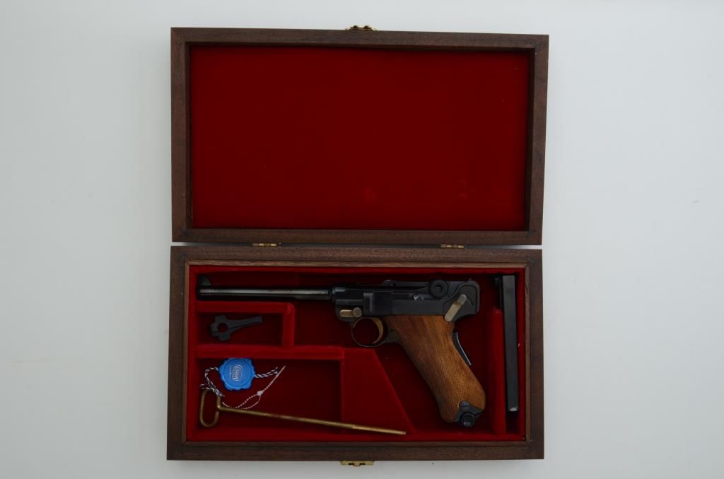 Re-issue thru Interarms of Mauser Naval Luger semi-auto pistol, 9mm cal., 5-3/4” barrel, blue finish checkered wood grips, #11-013667, in modern wood presentation case with extra magazine, instructions manual, cleaning rodand takedown tool. This gun is in like new condition showing little handling. Est.: $300-$600.