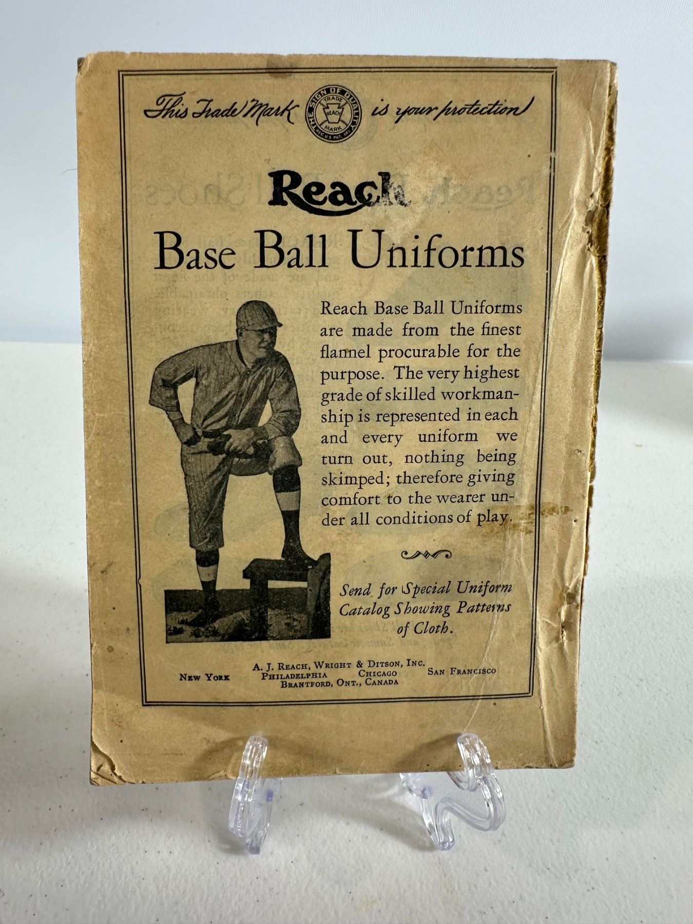 A.J. Reach advertising booklet promoting baseball uniforms and athletic goods; period typography and order info. Condition: Fair with age wear, small tears, and creasing.