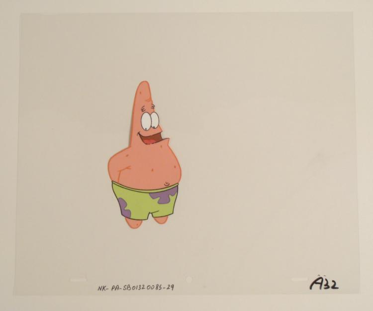This original animation cel is from the Nickelodeon TV show SpongeBob Squarepants. The story takes place under the deep blue sea in Bikini Bottom, where SpongeBob resides. SpongeBob, who is a yellow, porous sponge, is your typical happy-go-lucky character, as he is always cheerful and enjoys making people laugh. Patrick Star, SpongeBob's neighbor who is a starfish, is your average children's show idiot, as he boasts knowing nothing and is often getting himself into ridiculous situations. Between the homes of these two lies the home of the miserable Squidward, a squid, who is known for being grouchy and playing tricks on SpongeBob and Patrick. Both SpongeBob and Squidward work at the Krusty Krab, a fast food business run by the greedy money-loving Mr. Krabs, a crab, the arch rival of the evil, possibly misunderstood, Plankton. Another neighbor, Sandy Cheeks, an athletic squirrel who normally wears an astronaut's space suit, was introduced in "Tea at the Treedome." She spends most of her time inventing and experimenting. * Patrick is reaching in his pants * Original Production Animated Cel Overall Size of Cel: 10 1/2" x 12 1/2" Very Good Condition This is an original hand-painted cel set-up used in the production of an episode of "SpongeBob SquarePants." Each one-of-a-kind set-up represents a slight change in position of the characters. When individually photographed and projected in rapid succession, the images appear to move. * To create production cels, the original animator's drawing is transferred onto an acetate cel (by hand-inking and/or photo copying). The cel is then hand-painted on the reverse side. * The cel received by the winning bidder may be ever so slightly different from the one in the auction photos. * The cel is ready to be matted and framed. The animator's notations are at the bottom of the cel. * *