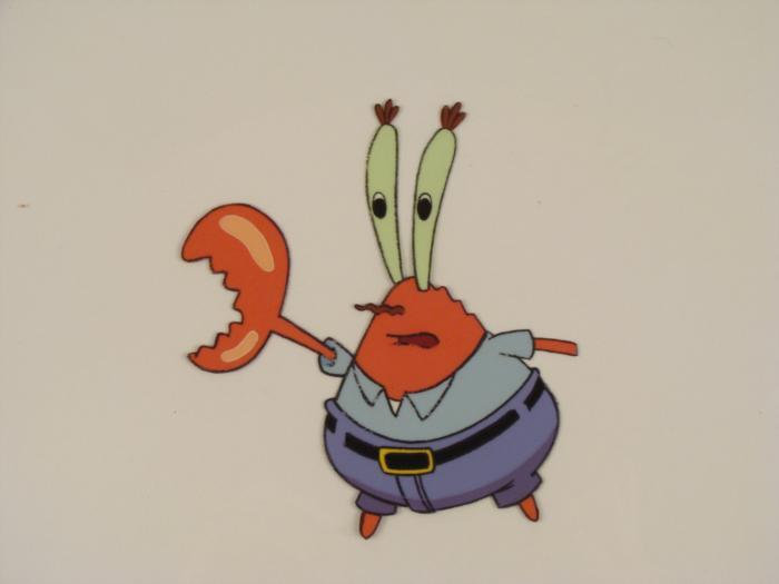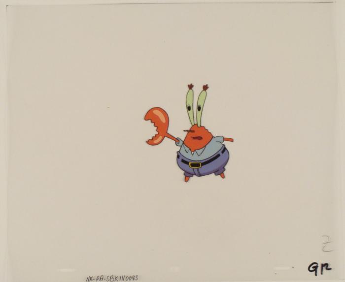 This original animation cel is from the Nickelodeon TV show SpongeBob Squarepants. The story takes place under the deep blue sea in Bikini Bottom, where SpongeBob resides. SpongeBob, who is a yellow, porous sponge, is your typical happy-go-lucky character, as he is always cheerful and enjoys making people laugh. Patrick Star, SpongeBob's neighbor who is a starfish, is your average children's show idiot, as he boasts knowing nothing and is often getting himself into ridiculous situations. Between the homes of these two lies the home of the miserable Squidward, a squid, who is known for being grouchy and playing tricks on SpongeBob and Patrick. Both SpongeBob and Squidward work at the Krusty Krab, a fast food business run by the greedy money-loving Mr. Krabs, a crab, the arch rival of the evil, possibly misunderstood, Plankton. Another neighbor, Sandy Cheeks, an athletic squirrel who normally wears an astronaut's space suit, was introduced in "Tea at the Treedome." She spends most of her time inventing and experimenting. Mr. Krabs appears to be reaching out.Original Production Animated Cel Overall Size of Cel: 10 1/2" x 12 1/2" Very Good ConditionThis is an original hand-painted cel set-up used in the production of an episode of "SpongeBob SquarePants." Each one-of-a-kind set-up represents a slight change in position of the characters. When individually photographed and projected in rapid succession, the images appear to move.
