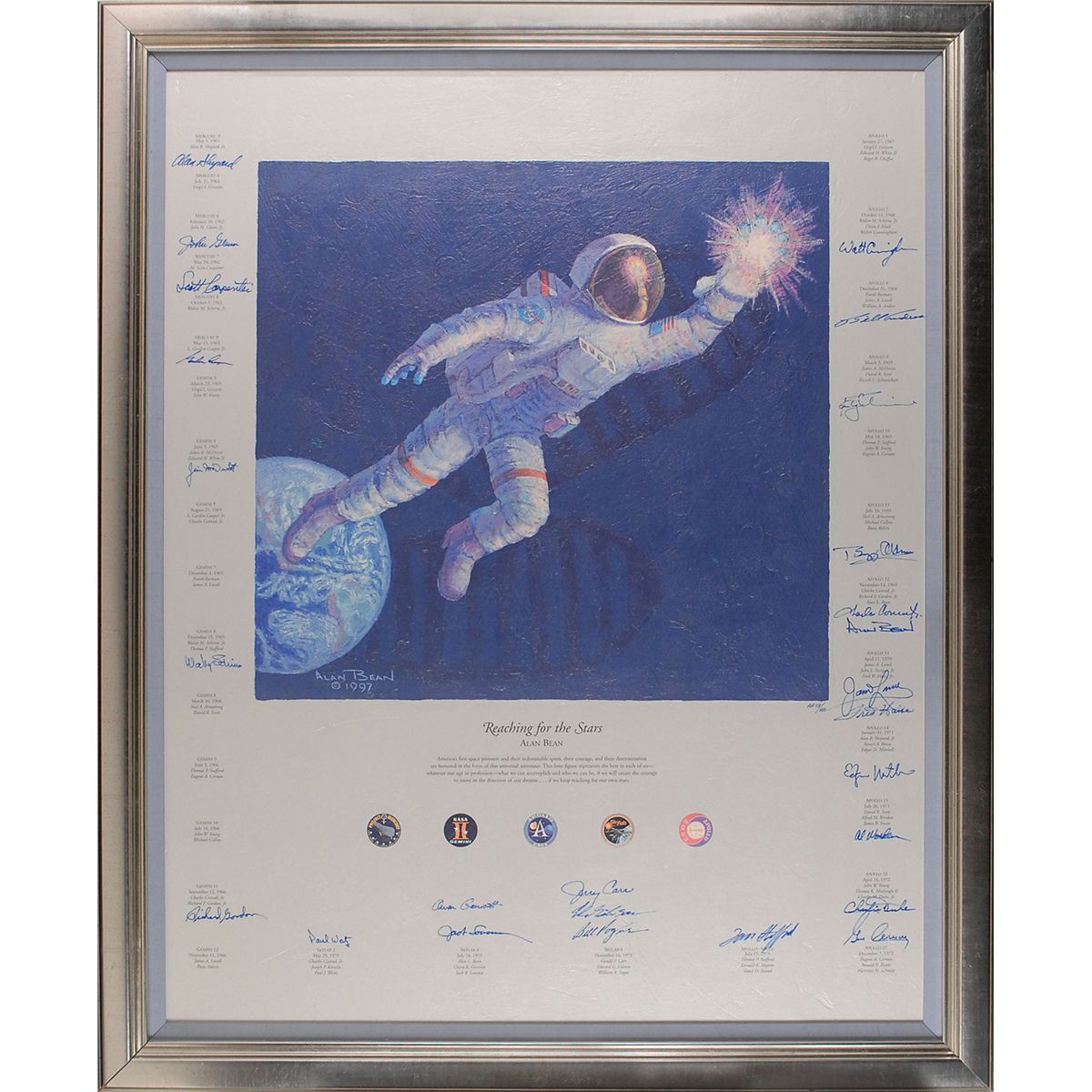 Limited edition color 26.5 x 33.5 textured canvas print entitled ‘Reaching for the Stars by Alan Bean,’ AP119/150, signed in blue felt tip by 24 astronauts from the Mercury, Gemini, Apollo, and Skylab programs. Signers are: Alan Shepard, John Glenn, Scott Carpenter, Gordon Cooper, Jim McDivitt, Wally Schirra, Richard Gordon, Walt Cunningham, Bill Anders, Rusty Schweickart, Buzz Aldrin, Charles Conrad, Alan Bean, James Lovell, Fred Haise, Edgar Mitchell, Al Worden, Charlie Duke, Gene Cernan, Tom Stafford, Paul Weitz, Owen Garriott, Jack Lousma, Jerry Carr, Ed Gibson, and Bill Pogue. Framed, without glass, to an overall size of 38 x 31.5. In very fine condition. Accompanied by a certificate of authenticity from Bill Pogue stating this print is from his personal collection. Oversized.