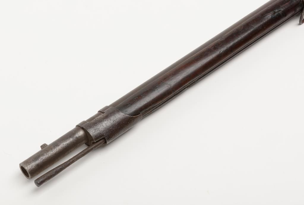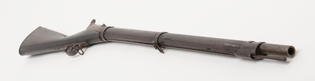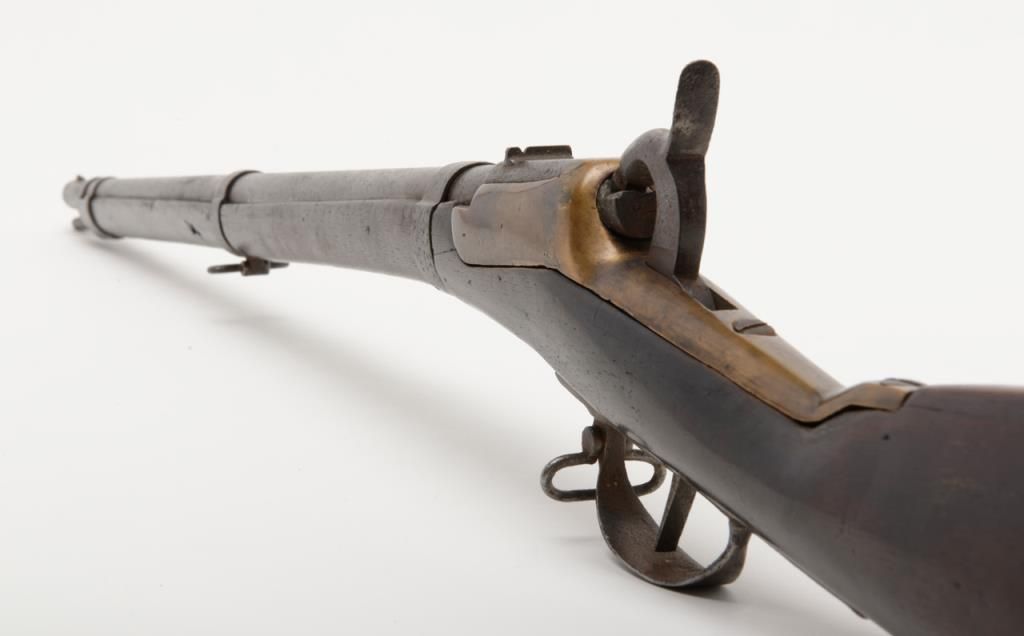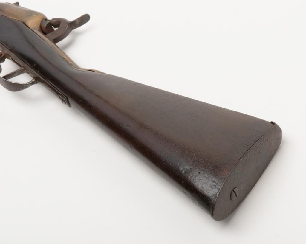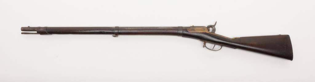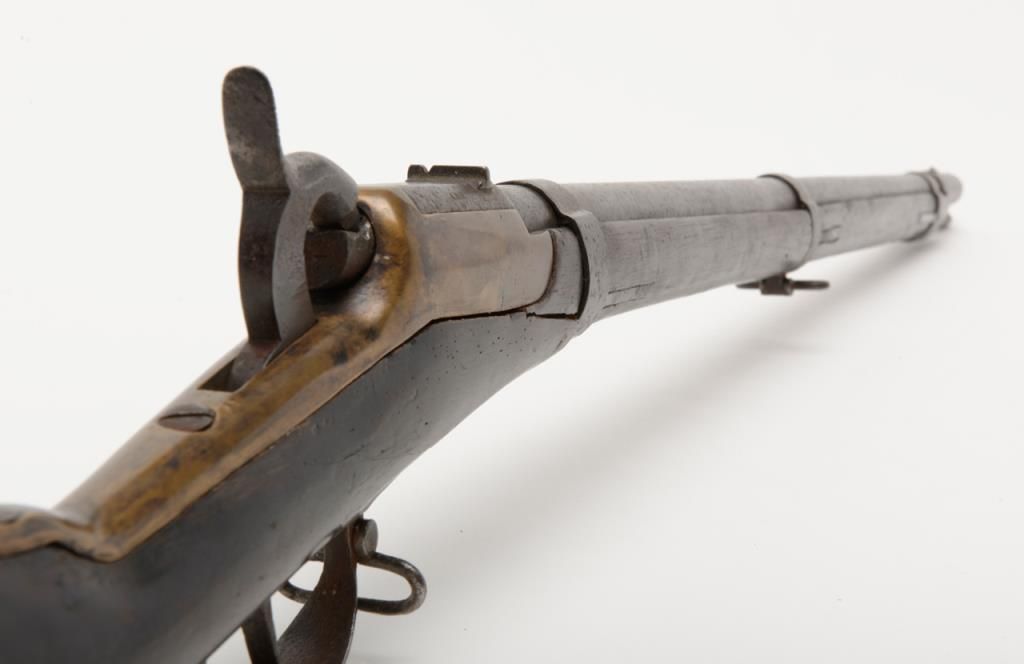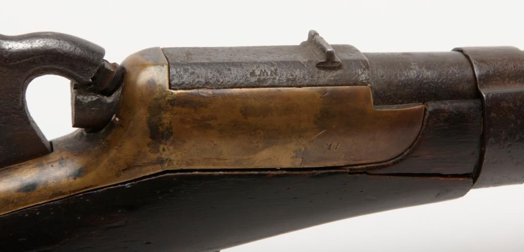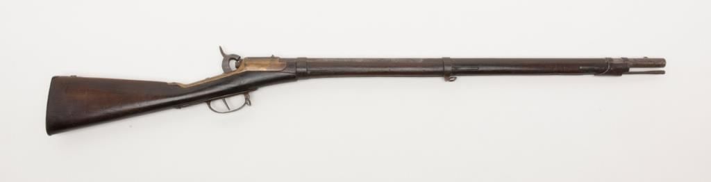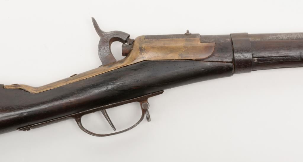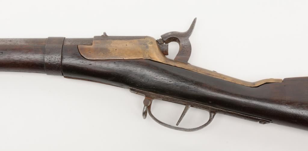 Read & Watson Confederate issue rifle formerly identified as the work of J.B. Barrett. Both Read and Barrett were from Virginia. The rifle shows a large brass breech with 33” barrel and 48” over all in .54 caliber percussion. These rifleutilized Hall rifle parts in inventory at Virginia Armories (Refer Flayderman 10-025). The barrel shows light to slightly heavy scattered pitting and erosion within a gray to brown patina finish which matches the hammer and trigger guard well.The bands show light to heavy scattered pitting. The brass was cleaned long ago and is now aging back nicely. The stock is good with some darkening, a crack between the frame and the forend and another crack on the bottom of thestock by the trigger guard. Showing some small losses around the ramrod channel and some shrinkage around the butt plate with weathering. The original sling swivels are retained and a pitted ramrod that matches the patina is included. No evidence of restoration of any sort and a very difficult to obtain Confederate arm with the more desirable large brass breech. The collection of William A. Gary consigned by his estate. Est.: $8,500-$17,000