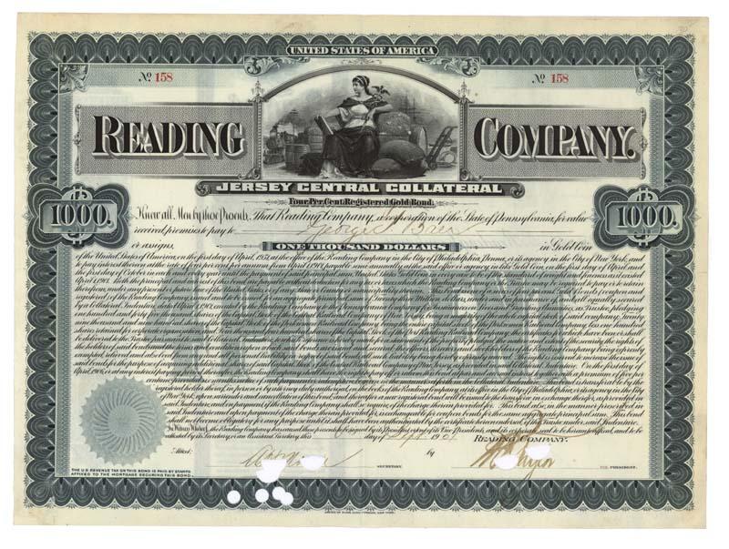 1907, Pennsylvania. Bond for $1000 bearing 4%. Grey/Black. Vignette at top center of seated female allegorical figure with steam locomotive and ship in background. Punch cancelled. Very Fine.