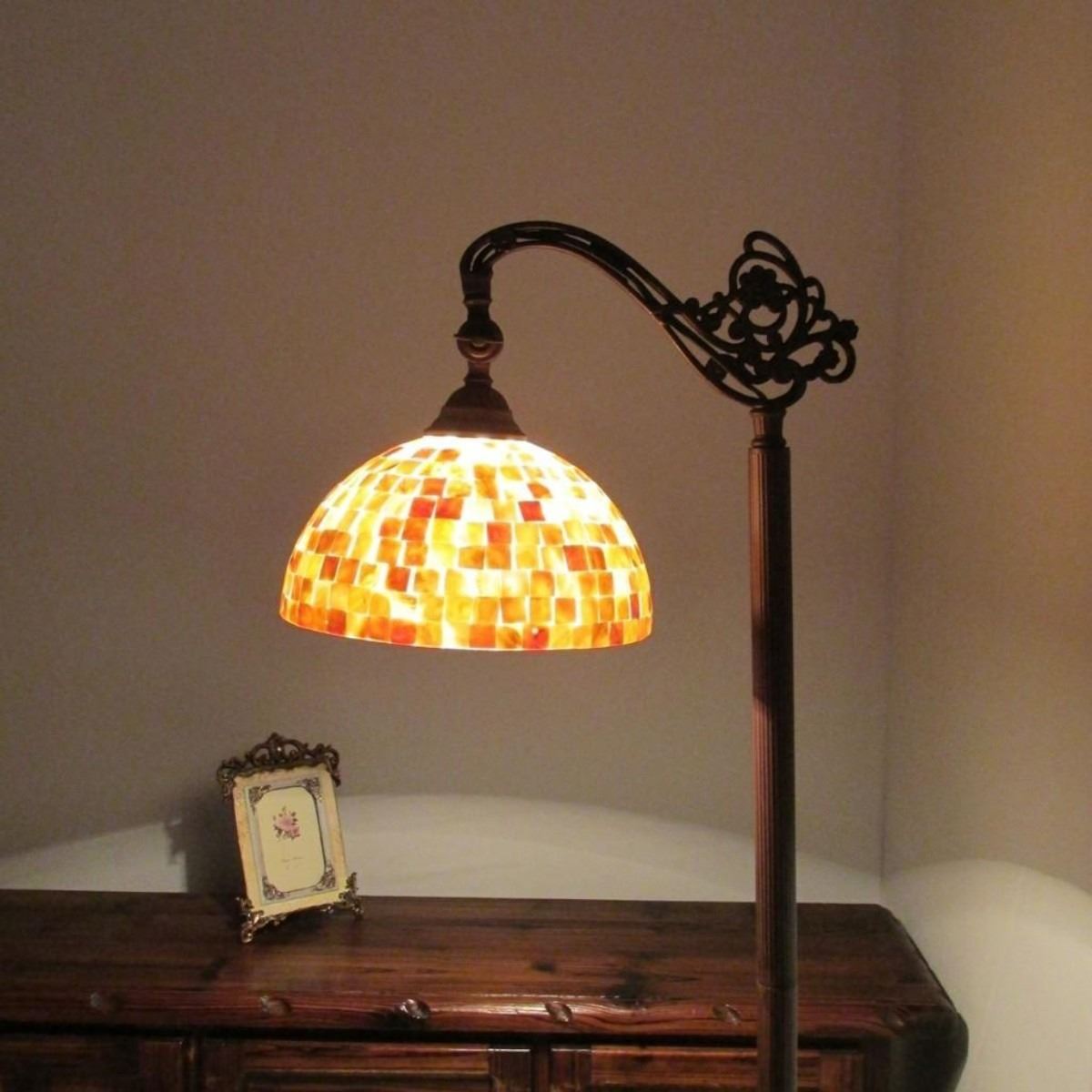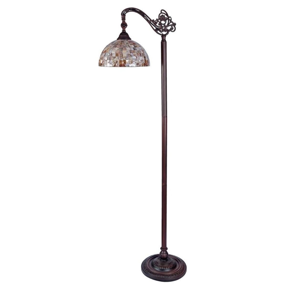 SHELLEY Tiffany-style 1 Light Reading Floor Lamp 11" Wide SHELLEY, a beautifully Mission style hand-crafted reading floor lamp with intricate designed and natural seashell on top of the glass shade.Lampshade design features multi-toned colored pieces. Expertly crafted with top quality materials. Shade Width (in)11.30 Shade Height (in)5.51 Overall Height (in)62.20 Base Width (in)11.20 Base Height (in)62.20 Net Weight (lbs)14.00 Light Direction Downlight Light Bulb Types(2) 100 Watt max E26 Type A Bulb (not included) Power Source Corded-Electric, Wall Plug Electric Wire Length (in)87 Switch TypePull Chain Shade Shape Round Shade MaterialsTiffany-glass Est. Glass Cuts372 Finish Blackish Bronze Overall MaterialsGlass, metal, resin & electrical components Specific UsesIndoor
