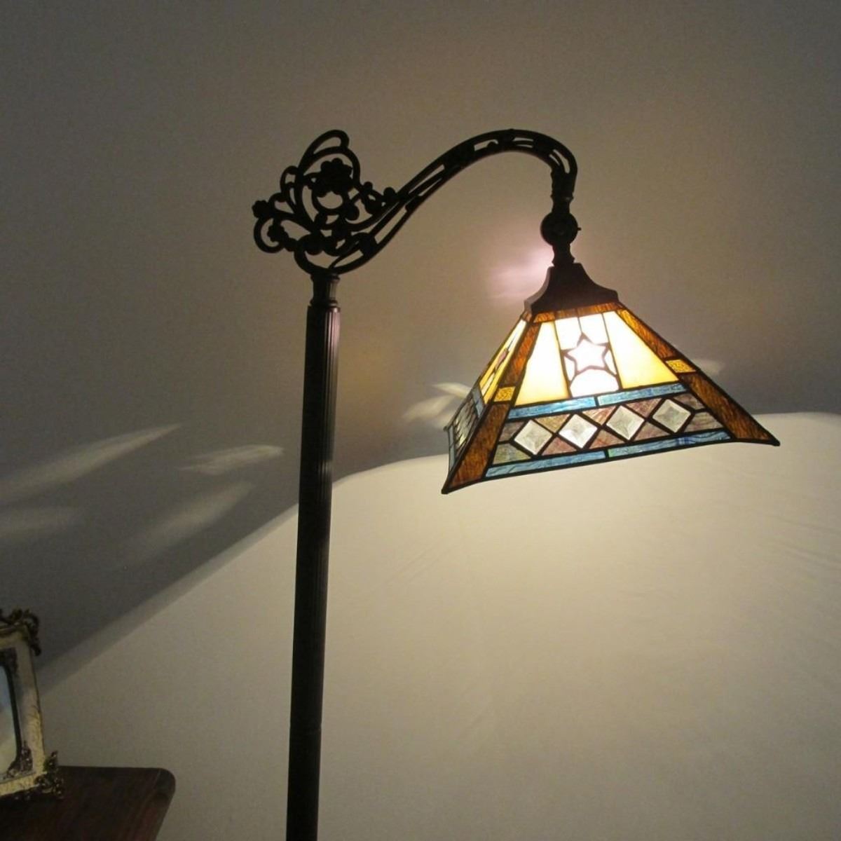 TRISTAN Tiffany-style 1 Light Reading Floor Lamp 11" Wide KINSEY, a beautifully Mission style hand-crafted reading floor lamp with intricate designed and cut glass shade. Lampshade design features multi-toned antique colored pieces accented with a row of matching cut circles. Coated in an antique bronze patina tone. Expertly crafted with top quality materials. Shade Width (in)11.00 Shade Height (in)5.51 Overall Height (in)61.4 Base Width (in)10 Base Height (in)61.4 Net Weight (lbs)13.67 Light Direction Downlight Light Bulb Types(2) 100 Watt max E26 Type A Bulb (not included) Power Source Corded-Electric, Wall Plug Electric Wire Length (in)87 Switch Type Pull Chain Shade Shape Round Shade Materials Tiffany-glass Est. Glass Cuts 116 Finish Dark Antique Bronze Overall Materials Glass, metal, resin & electrical components Specific Uses Indoor