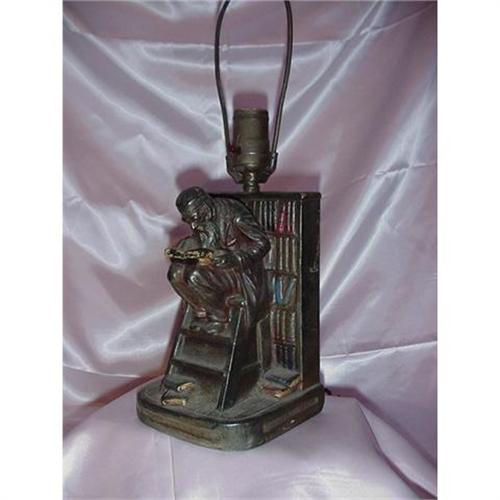 An early 20th century copper clad figural lamp, 18" tall to top of finial, 7 3/4" tall to top of figure, 5" wide. the figure of a Rabbi reading. Condition is fair, there is loss to the painted finish but there are no breaks to the cladding and the lamp should be rewired. A very nice old lamp for a study or library.