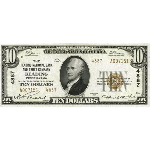 <B>Reading, PA</B></I> - $10 1929 Ty. 2 <B>The Reading NB & TC</B></I> Ch. # 4887<BR>Strong punch-through embossing decorates this delightful $10. A few counting crinkles are noticed in the lower right-hand corner. <B>Choice About Uncirculated.</B></I>