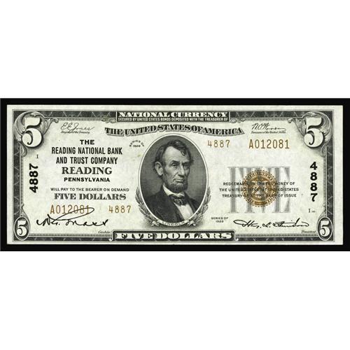 <B>Reading, PA</B></I> - $5 1929 Ty. 2 <B>The Reading NB & TC</B></I> Ch. # 4887<BR>A crackling fresh <B>Choice Crisp Uncirculated</B></I> example.