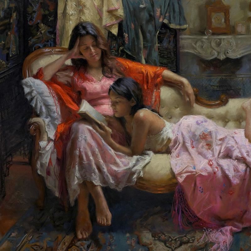 "Reading Time" is a limited edition giclee on canvas by Vicente Romero. The piece is hand signed, numbered, and come with a certificate of authenticity. Measures approximately 22.5" x 28".