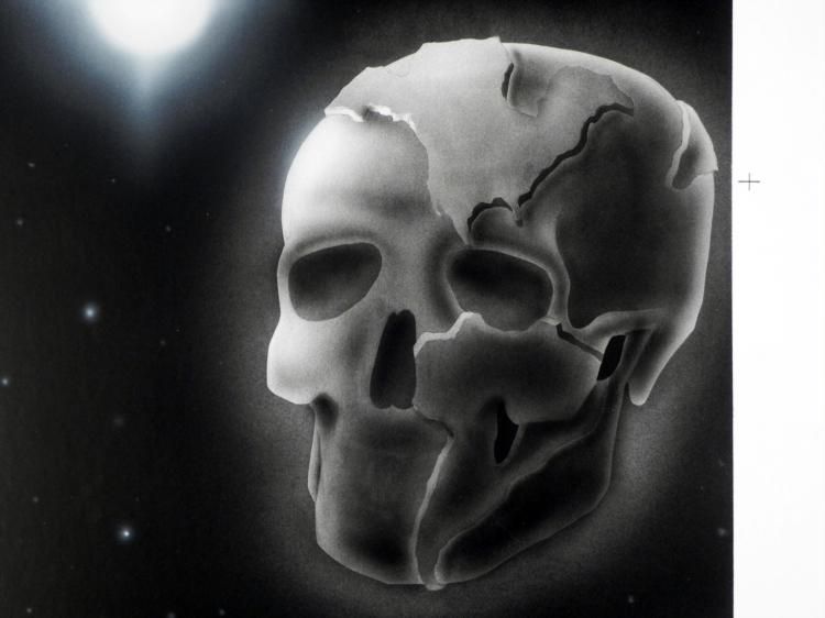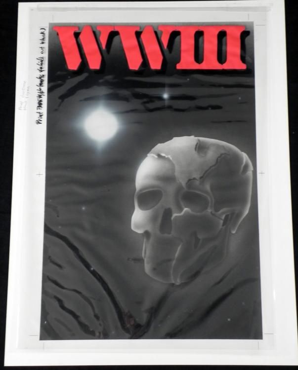 It appears that Don is already preparing the world for another world war with his dark depiction a fractured skull floating around in space, looking for chaos... * * * * * Artist: Don WeaverTitle: WWIIIMedium: Print prepared for printing on cardboardPresentation: Two-layer cel overlay with text that is taped to cardboardPrinters Marks: Top leftImage Size: 11 1/2" x 17 1/4"Overall Cel Size: 13 1/4" x 19"Backing Size: 15" x 20"Condition: Excellent * * These are some of the original pieces that Don offered too potential clients, as part of his portfolio. Most of them were done in the earlier years of his life. * * * * * Don Weaver has over 20 years of experience in advertising, marketing, and graphics; he has the experience and ability to communicate your message in a creative, effective, and memorable way. * Most recently, he spent six years as the Advertising Creative Manager (and Graphics Manager) with The Tampa Tribune. Previous positions included creative director and art director for agencies in Phoenix and Memphis, * production manager for a major printing company, and marketing director for an international nutritional supplement company. In addition to creative strategy development and graphic design, he has extensive experience * in broadcast, video, and digital media production. Don originally started out as a photographer, but soon realized that he was even stronger in design and writing. That photographic background still gives Don a unique perspective that translates into his design * style. * *